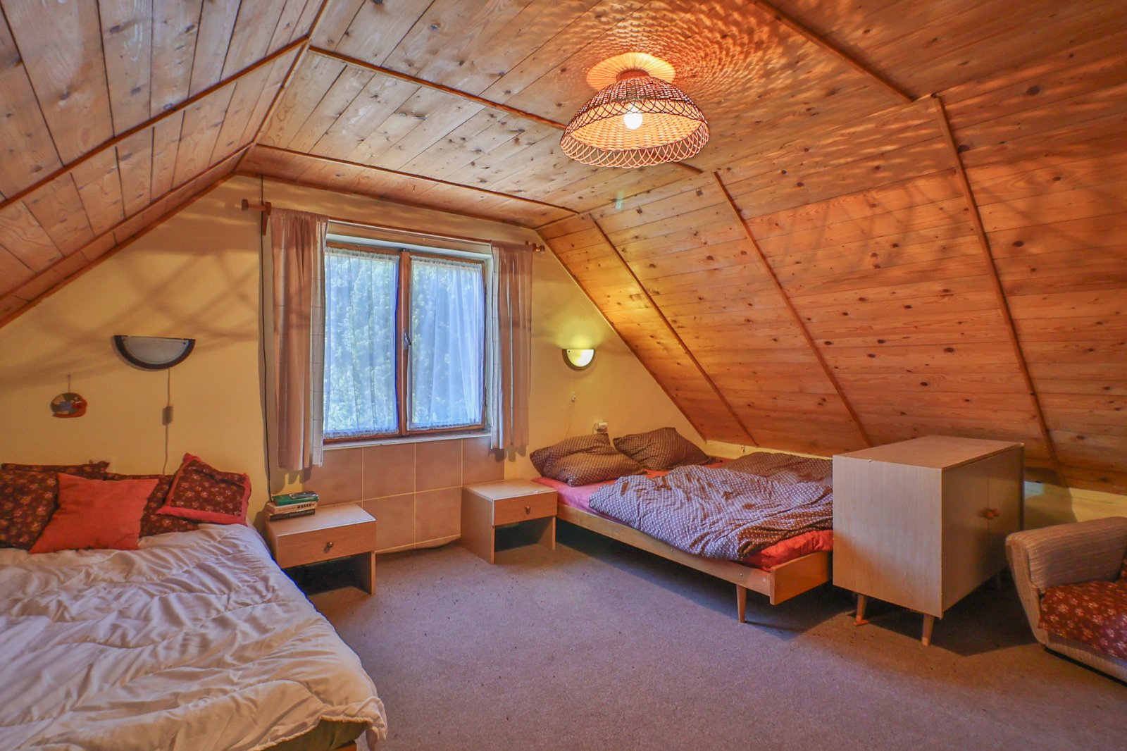 Podkroví nabízí útulnou ložnici se čtyřmi lůžky a výhledem do okolní zeleně.