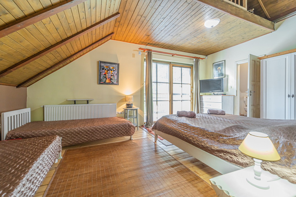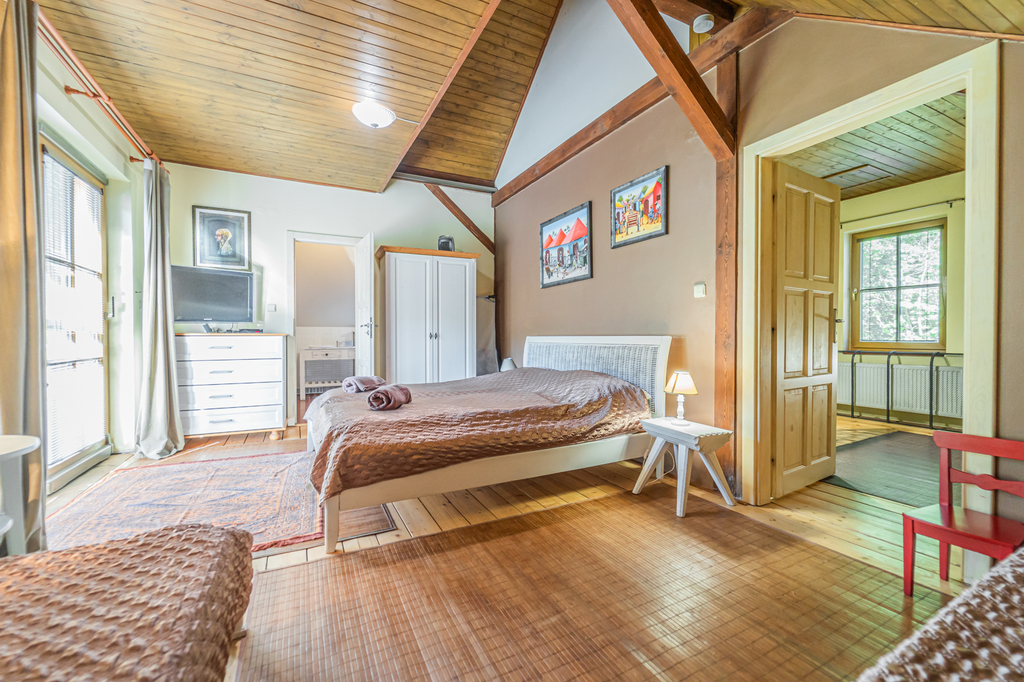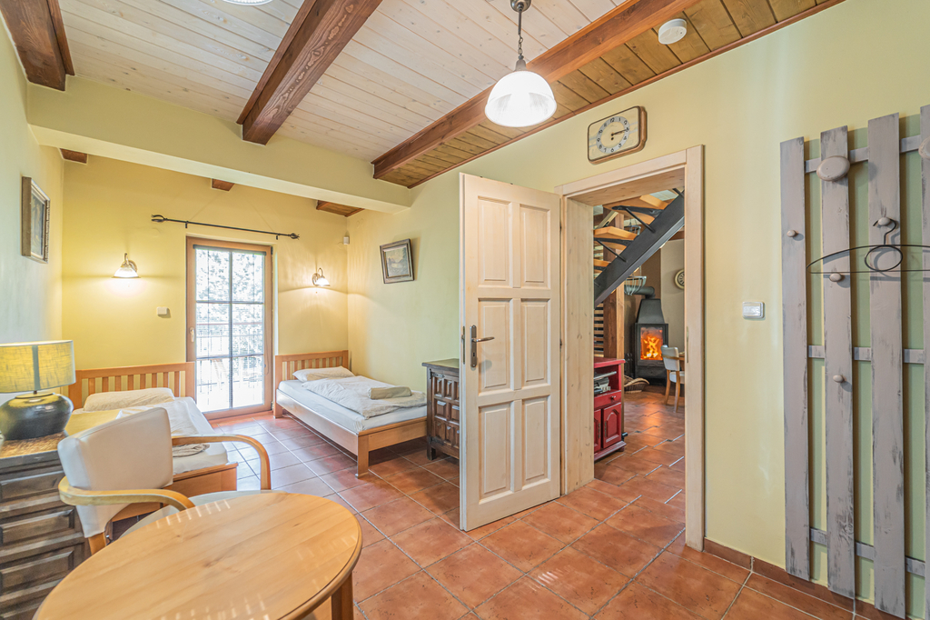 Chalupa nabízí celkem tři ložnice (14, 10 a 18 m2), kde pohodlně přespí až 9 osob, dvě haly (10 a 12 m2), obytnou místnost s kuchyní (20 m2), dvě koupelny s WC (10 a 3 m2), technickou místnost (12 m2), komoru (1,7 m2), dva sklepy (11 a 5 m2), dva balkony, terasu malou půdu.