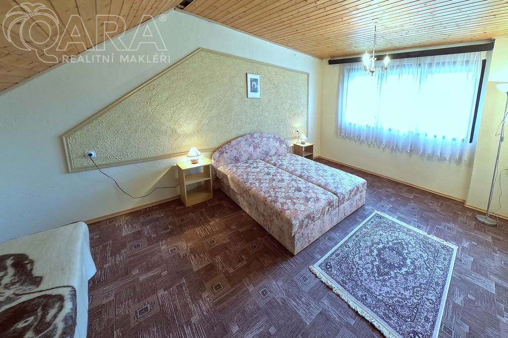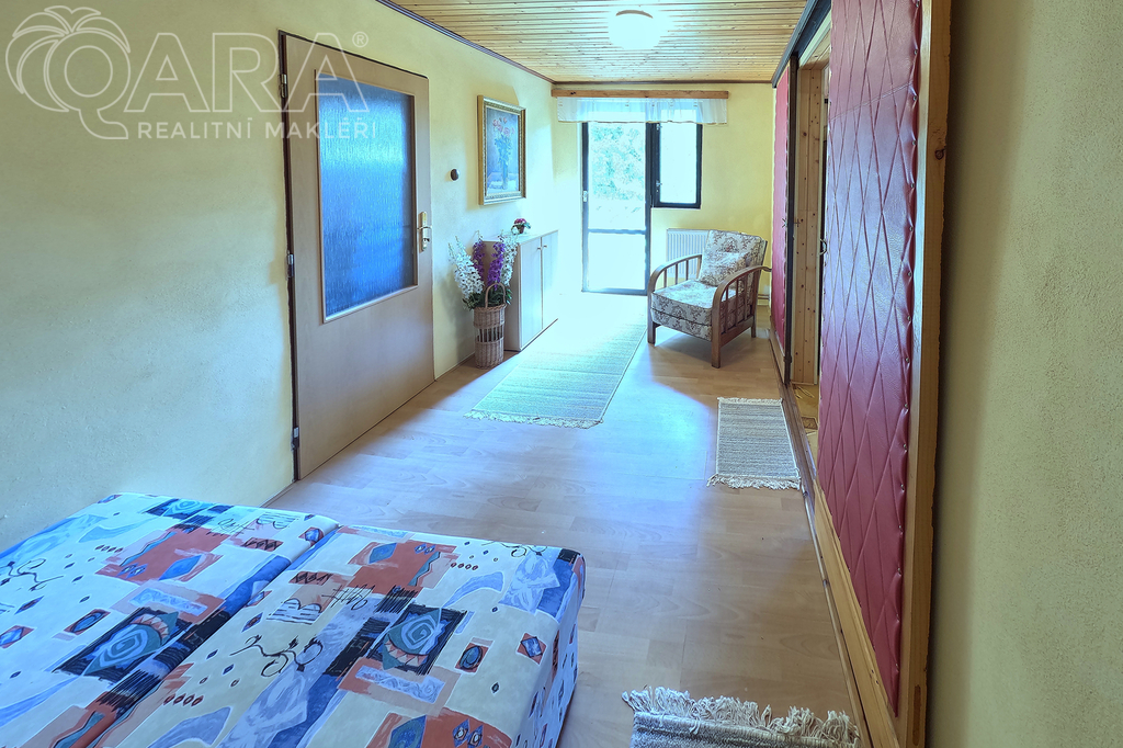 V patře jsou pak dvě průchozí ložnice a jako bonus velký balkón s výhledem na zalesněný protilehlý kopec.