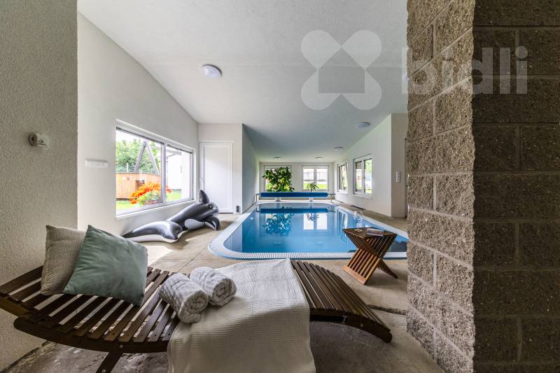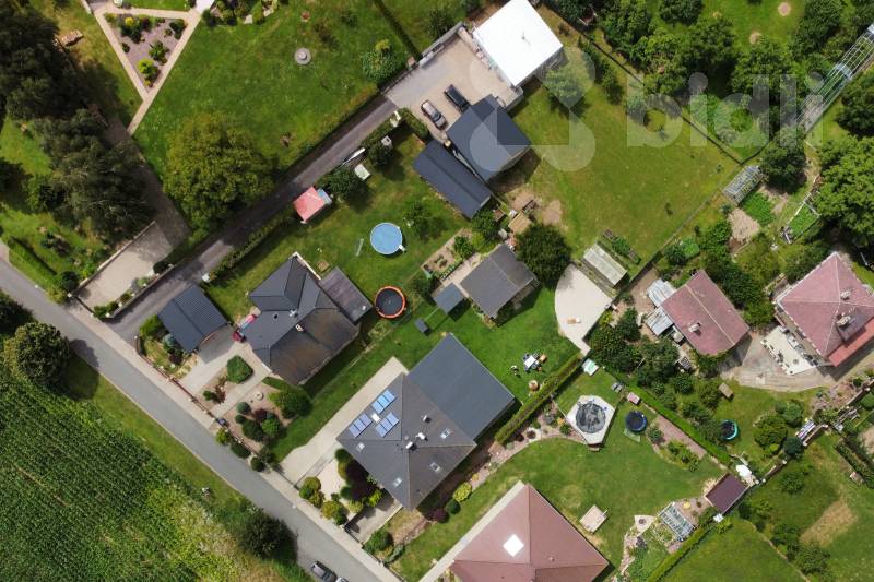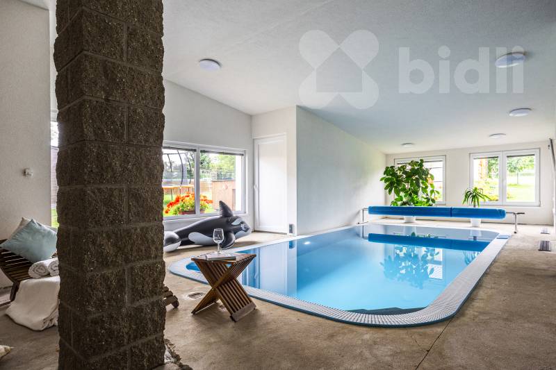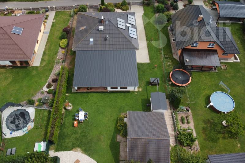 Hlavní dominantou je nadstandardní rodinný dům o téměř 400 m², který nabízí veškerý komfort moderního bydlení. Dům je vybaven rekuperací, klimatizací, solárními kolektory a krytou terasou, ze které se otevírá krásný výhled do krajiny. Součástí domu je také krytý bazén o rozměru 6 × 3 metry s protiproudem a slanou vodou, napojený na solární ohřev.