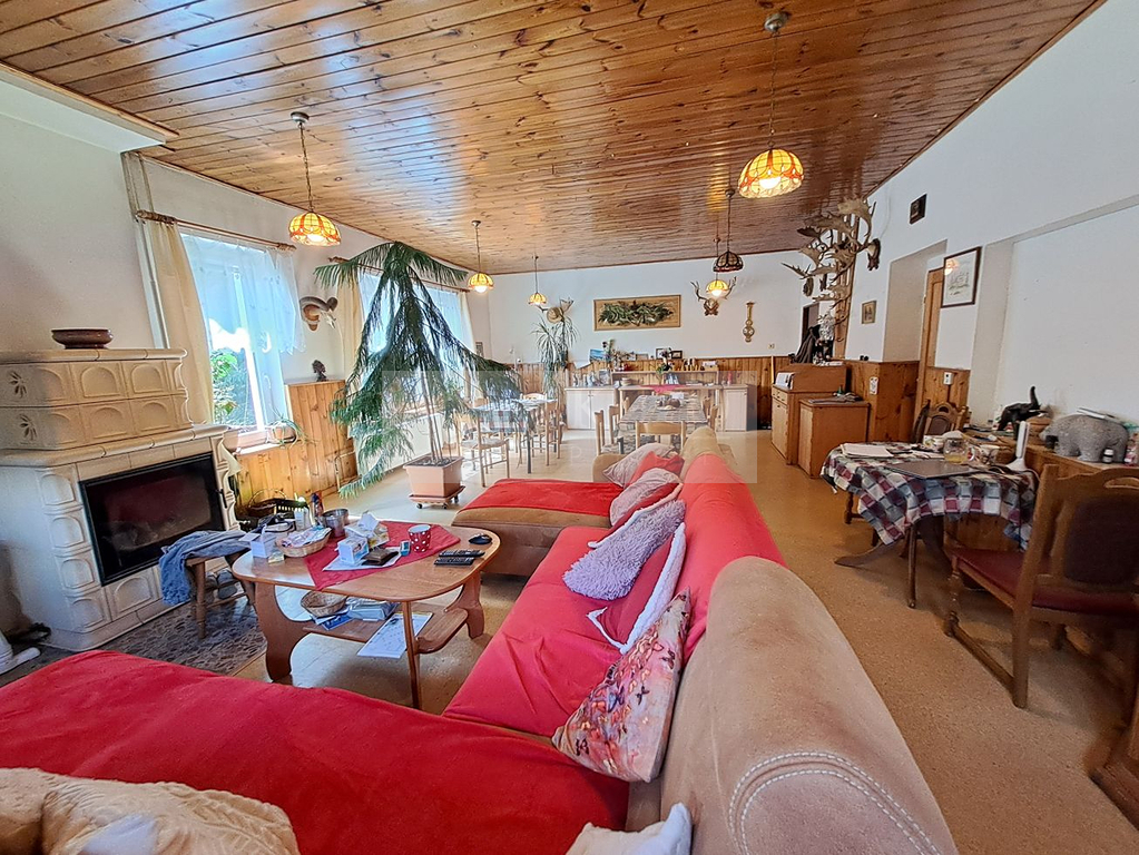 • Hlavní budova (12 lůžek): 6 pokojů s vlastním sociálním zařízením, velká jídelna s krbem (ideální pro restauraci či společenskou místnost), plně vybavené zázemí.