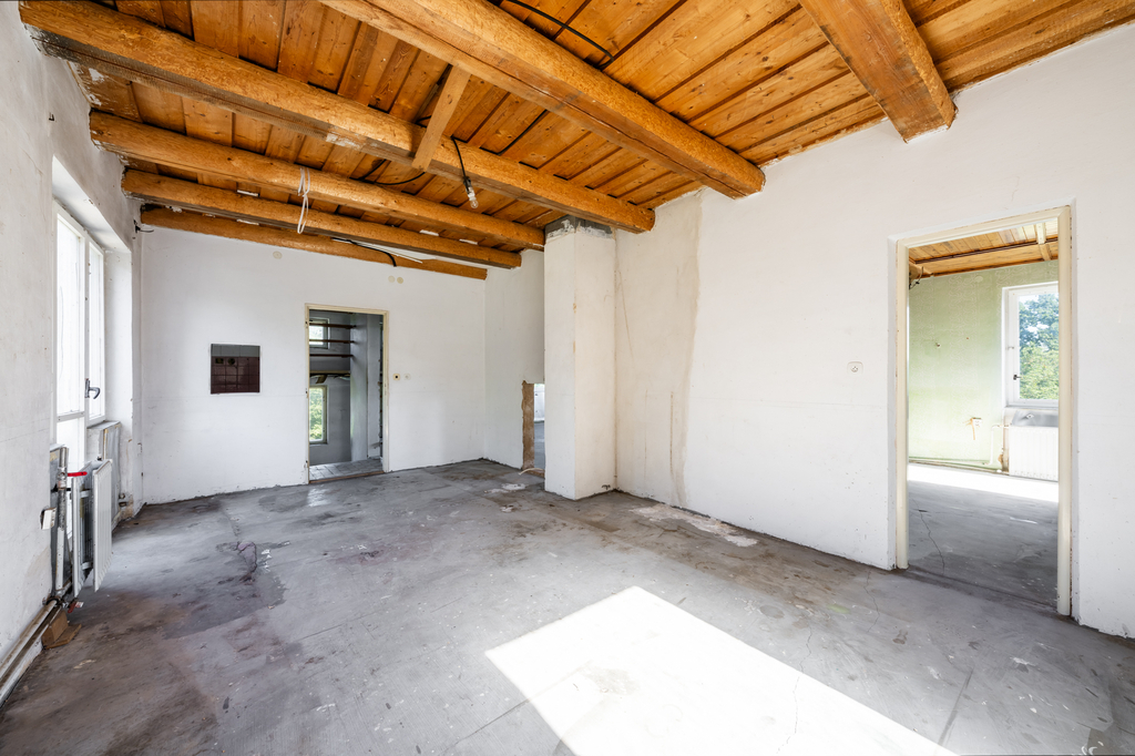 Dům je částečně podsklepený a disponuje dvěma nadzemními podlažími a obytným podkrovím. V suterénu se nacházejí dvě praktické místnosti využitelné jako sklad nebo technické zázemí a schodiště propojující sklepní prostory s obytnou částí domu. Do sklepa je rovněž přístup ze zahrady. Přízemí domu tvoří kuchyň, obývací pokoj, samostatný pokoj, hala se schodištěm do patra, koupelna, spíž a zádveří. V patře se nacházejí dva prostorné pokoje a samostatná toaleta. Díky nadstandardní velikosti jednoho z pokojů lze prostor snadno rozdělit a vytvořit tak další ložnici, dětský pokoj nebo pracovnu. Podkroví nabízí jednu dokončenou místnost a rozlehlý půdní prostor, který lze v případě potřeby přestavět na další obytnou část. Díky své velikosti a tvaru krovu poskytuje podkroví značný potenciál pro rozšíření užitné plochy domu.