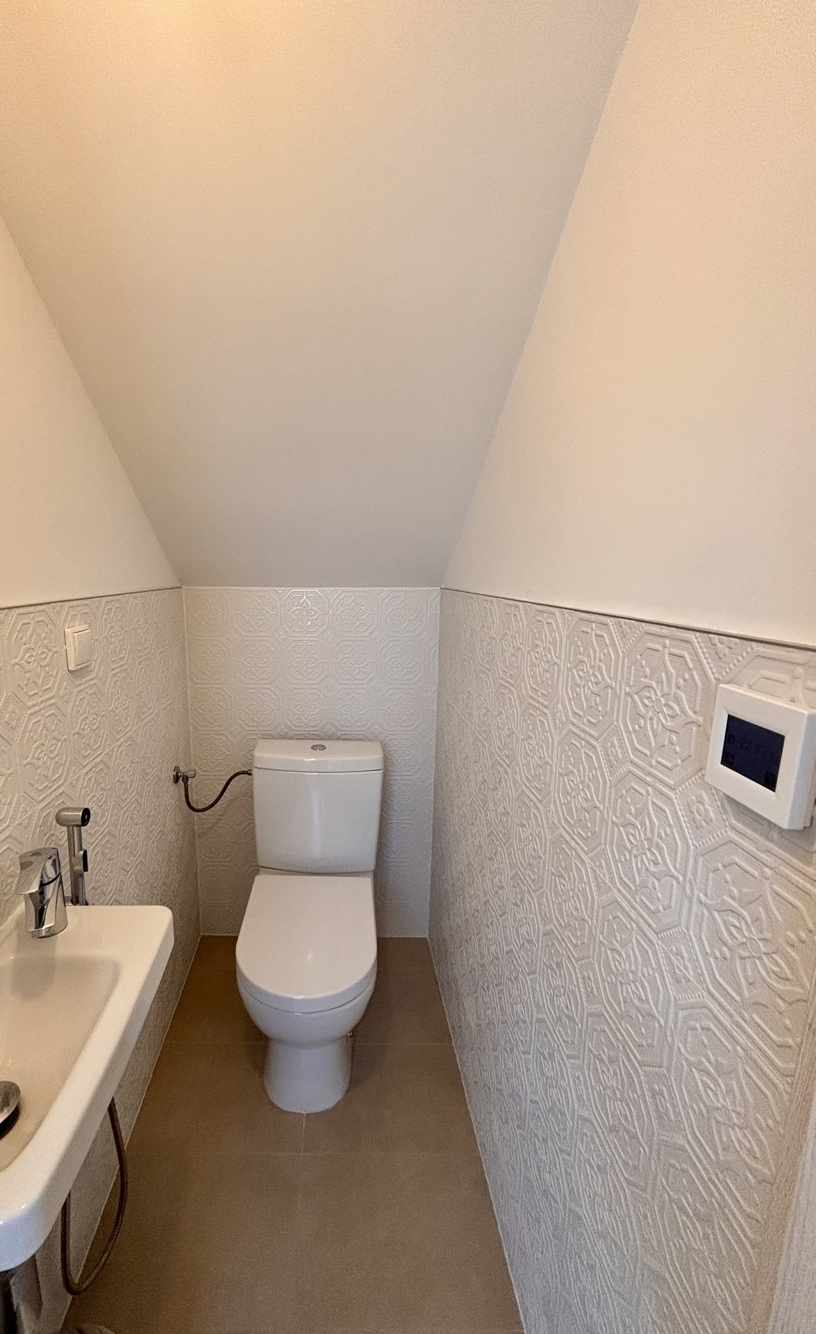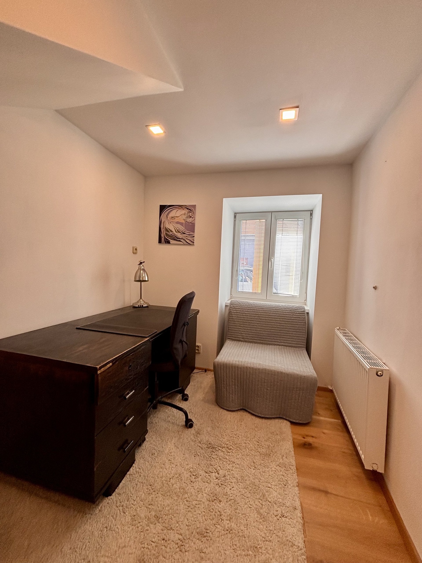 Dominantou domu je vzdušný obývací pokoj, který přirozeně navazuje na plně vybavenou kuchyň se spotřebiči. V přízemí dále naleznete pracovnu a koupelnu vybavenou vanou, pračkou, sušičkou a toaletou. V patře se nachází ložnice, další samostatné WC, sprchový kout a prostorný pokoj s vestavěnou skříní, který nabízí variabilní využití (dětský pokoj, obývací pokoj).