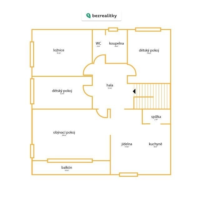 Přízemí: kuchyně se spíží propojená s jídelnou, obývací pokoj, dva pokoje, koupelna, samostatné WC, hala se schodištěm, balkón