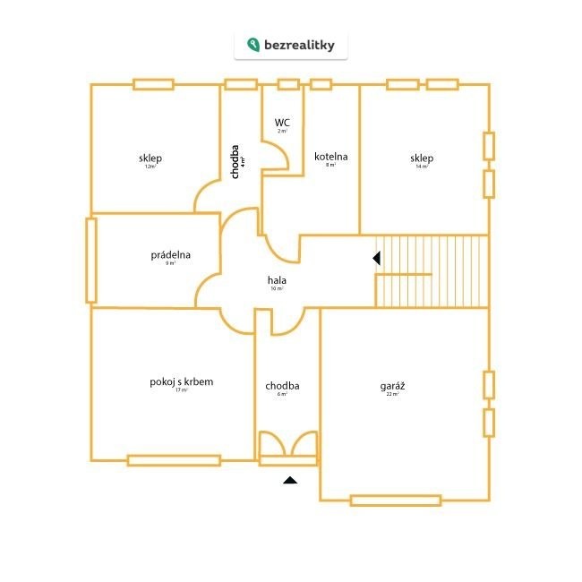 Suterén: garáž, pokoj s krbem, prádelna, dvě sklepní místnosti, kotelna/technická místnost, WC, chodba se schodištěm