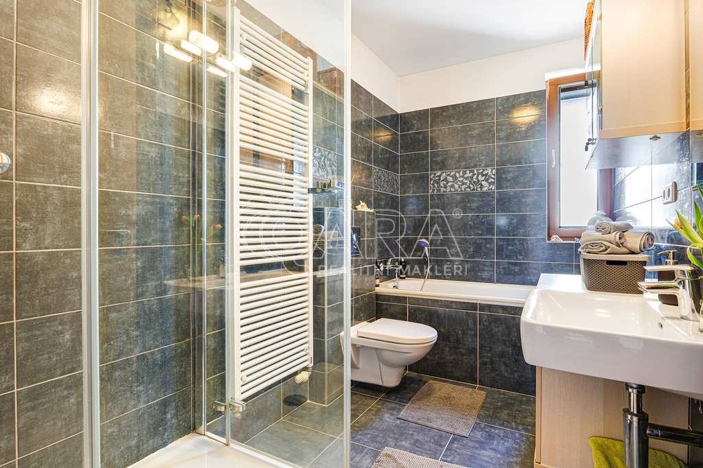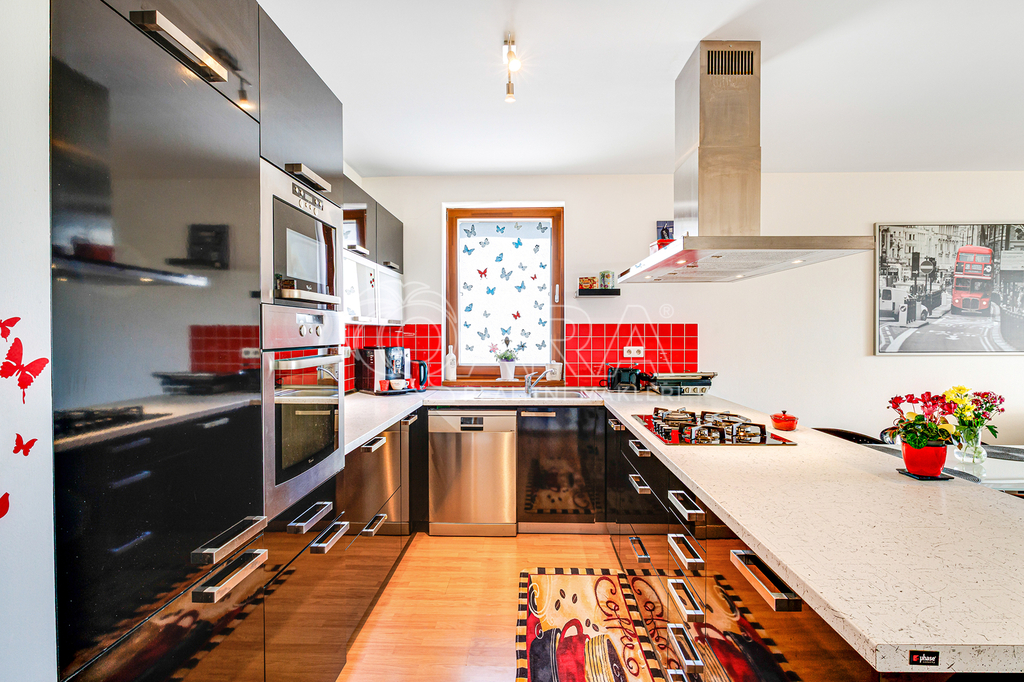 Dominantou celého domu je obývací pokoj o velikosti 42 metrů čtverečních, s úžasným výhledem do zahrady a přímým vstupem na terasu. Díky vysokému plotu si na zahrádce o velikosti 139 metrů čtverečních můžete užívat nerušeného soukromí nebo si užít pohodu s přáteli, třeba při grilování. V kuchyňské části domu najdete kompletně vybavenou kuchyňskou linku s plynovým sporákem, horkovzdušnou i mikrovlnou troubou, vestavnou lednicí s mrazákem a myčkou. Kuchyně díky své velikosti nabízí také dostatek úložných prostor.