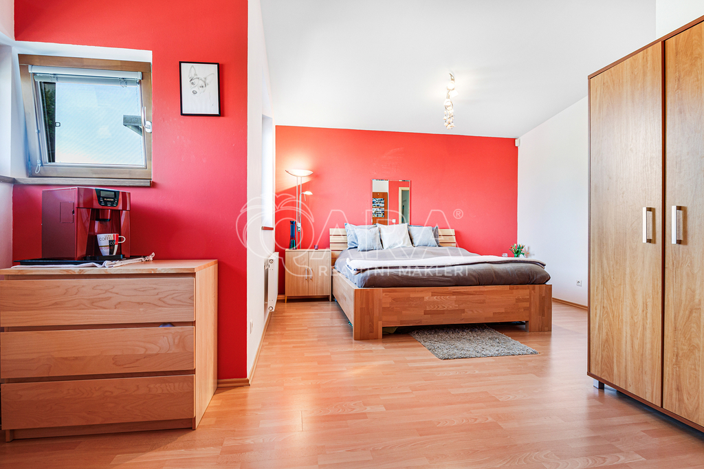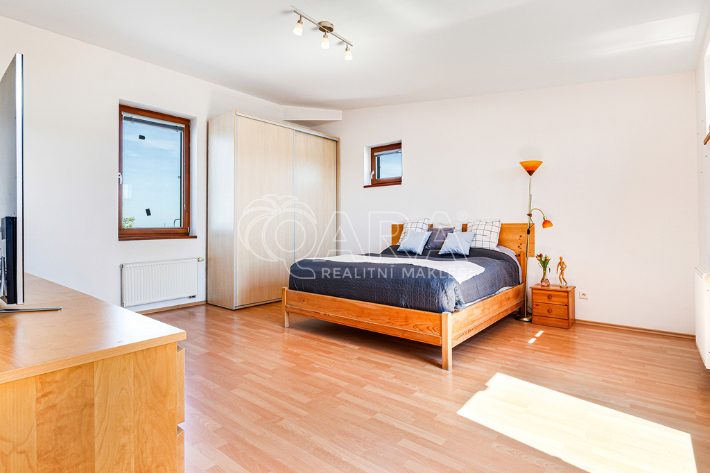 V horním patře domu se nachází velká manželská ložnice s další terasou. Ve středním patře mohou být dva dětské pokoje - aktuálně jsou ale spojené v jeden velký pokoj. Na patře se dále nachází koupelna s vanou. Pokoj pro hosty s druhou koupelnu se sprchovým koutem a komoru pak najdete v nejnižším podlaží domu. Z pokoje pro hosty je možné se přes venkovní schodiště projít na zahrádku. V domě jsou instalovány tři velké vestavěné skříně.