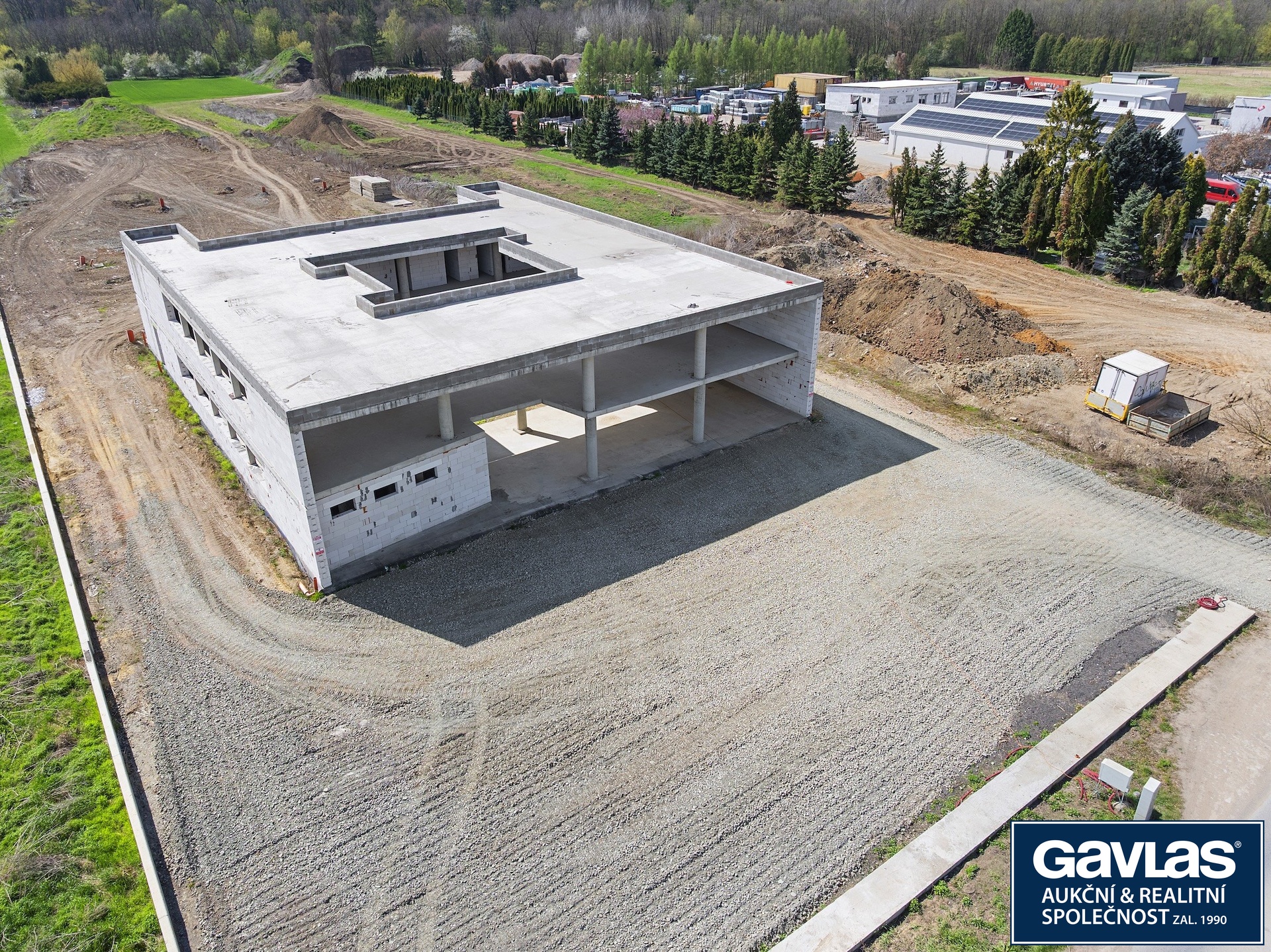 • Dvoupodlažní administrativní budovu ve fázi hrubé stavby s plánovanou užitnou plochou 983 m²