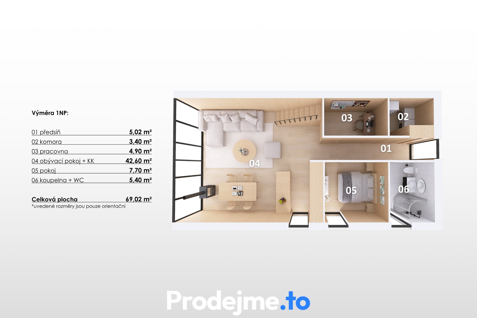 Uvnitř vás čekají dvě koupelny, teplovodní podlahové vytápění s elektrokotlem a krbová kamna, která večer vykouzlí tu pravou atmosféru. Plně vybavená kuchyň včetně vestavěné myčky ladí s promyšleným interiérem, klimatizace a rekuperace zase zajišťují čerstvý vzduch i příjemnou teplotu po celý rok. Každý centimetr prostoru má svůj smysl – nechybí ani chytré úložné prostory.