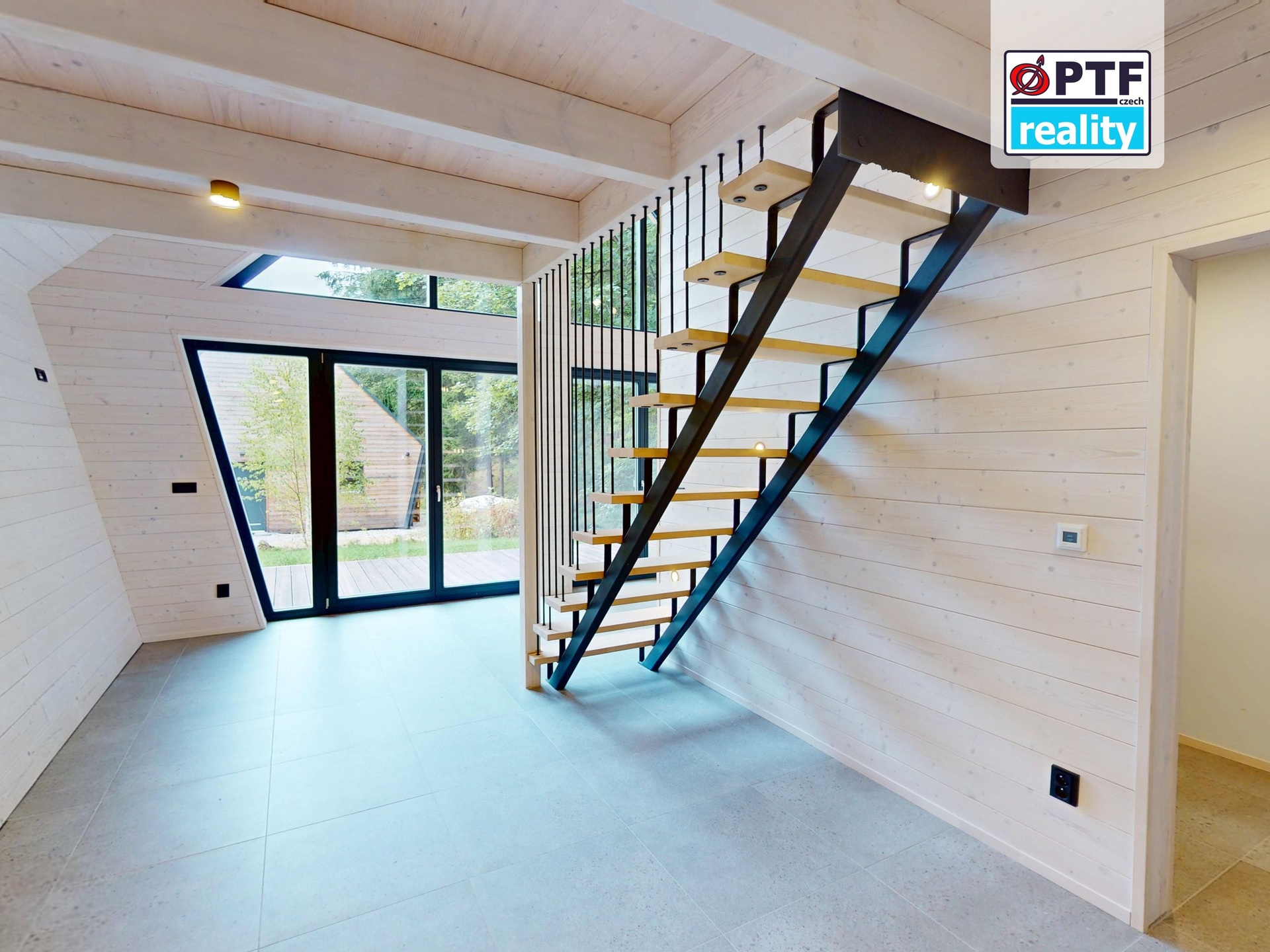 Přízemí: Dominantou je velký obývací pokoj s přípravou na krbová kamna a prostorem pro kuchyňský kout. Dále se zde nachází moderní koupelna se sprchovým koutem a přípravou pro saunu, samostatná toaleta a zádveří.