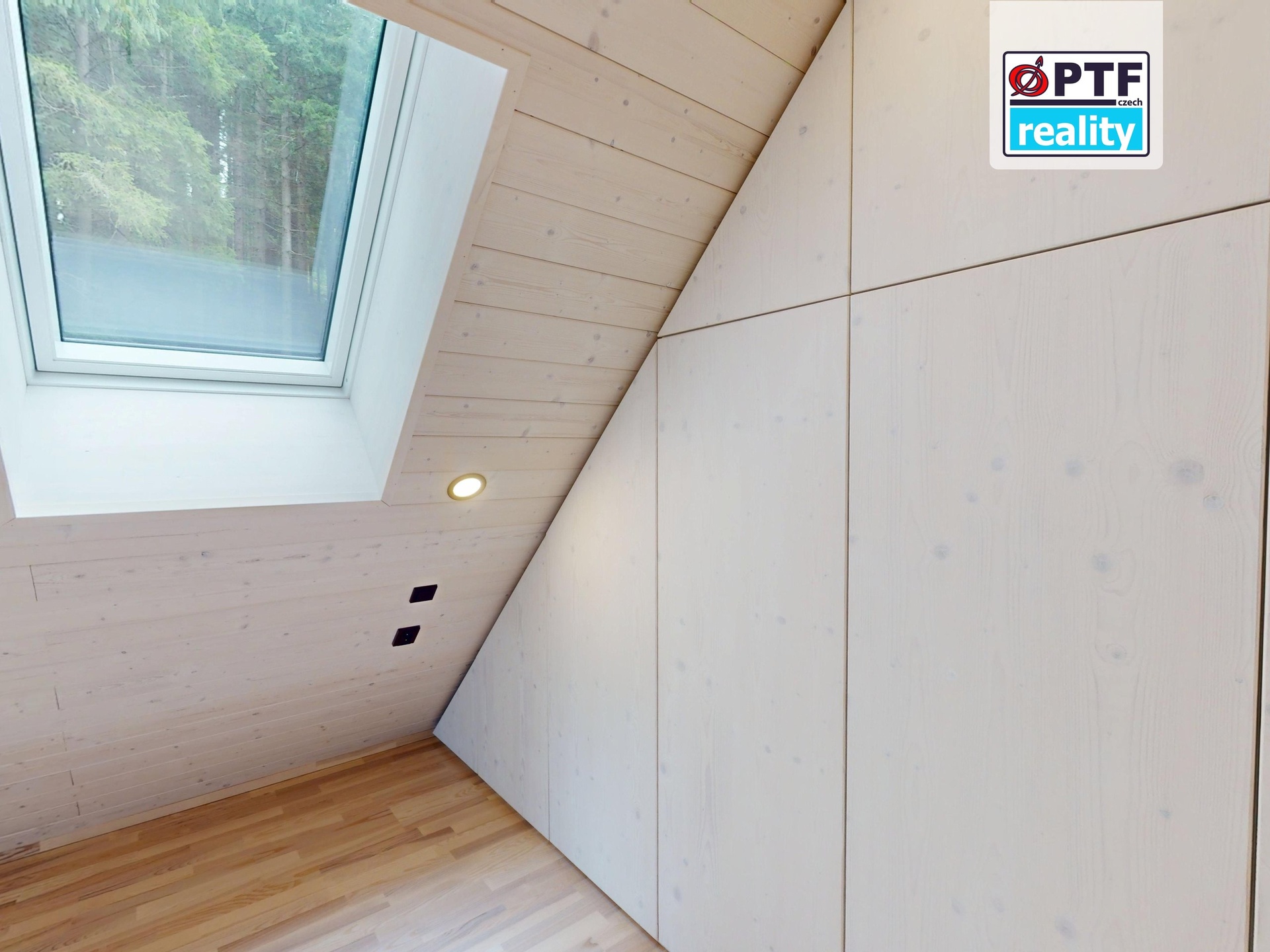 Úložné Prostor: V podkroví jsou již instalovány vestavěné skříně na míru, které efektivně využívají zkosený prostor.
