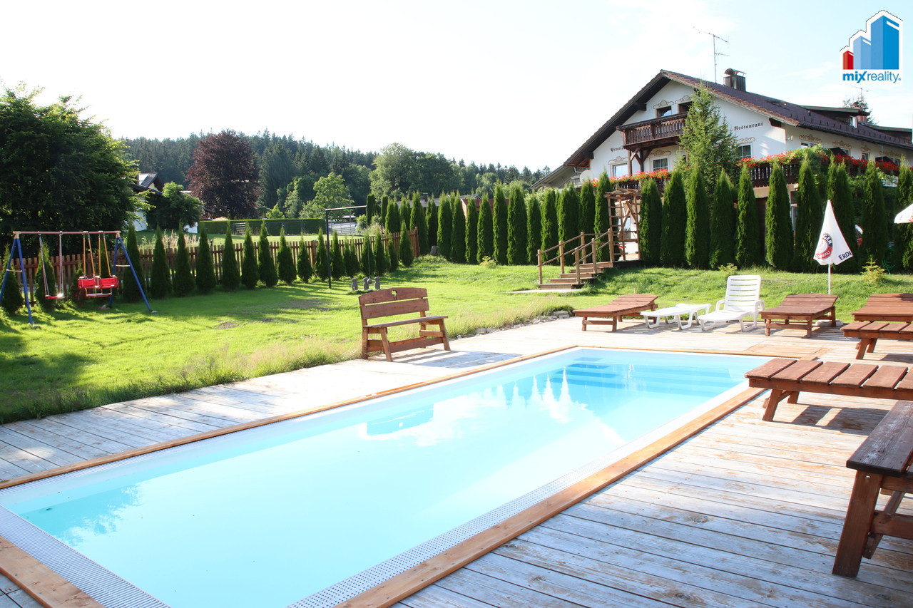 Výjimečná investiční příležitost. Naše realitní kancelář Mixreality nabízí k prodeji jedinečný hotelový areál v atraktivní turistické lokalitě Bavorského lesa, přímo pod oblíbeným sportovním areálem Geißkopf. Nemovitost se nachází přibližně 30 minut od Železné Rudy a představuje mimořádnou investiční příležitost v oblasti s celoroční turistickou návštěvností. Areál tvoří dva samostatné objekty, každý s vlastním pozemkem a výhledem na horu Geißkopf. Celková kapacita ubytování je přibližně čtyřicet ubytovacích jednotek, které zahrnují dvoulůžkové a třílůžkové pokoje, apartmány i samostatné byty. Hlavní budova slouží jako hotel s restaurací a pokoji pro hosty. Druhá budova má dva samostatné vchody a je vedena jako obytný dům s prostory pro podnikání. Jedna část nabízí další pokoje pro hosty, druhá část je tvořena byty a apartmány. Oba objekty jsou navzájem propojeny sklepní částí, zároveň však mohou fungovat i zcela samostatně. Součástí areálu je oblíbená restaurace nabízející českou i bavorskou kuchyni, wellness zázemí se saunou, posilovna, seminární místnost, dětské hřiště, garáž a přístřešek pro motorky. Příjemnou atmosféru celého místa doplňuje upravená zahrada s jezírkem, vodopádem a okrasnými KOI kapry. K nemovitosti náleží také stavební pozemek s venkovním bazénem a stylovým dřevěným altánem, který nabízí další možnosti rozšíření nebo vybudování doplňkových služeb pro hosty. Další pozemek u hlavní budovy zahrnuje nově postavenou stodolu, která je aktuálně využívána pro chov zvířat. Tento prostor může být využit například pro agroturistiku, ekologické hospodaření nebo koncept ekohotelu s vlastní bio produkcí. Lyžařský areál Geißkopf se nachází přibližně 500 metrů od hotelu a nabízí několik kilometrů upravených sjezdovek, snowpark, sáňkařskou dráhu i moderní lanovky. Lokalita je vyhledávaná nejen v zimní sezóně, ale také v létě, kdy se oblast mění v centrum outdoorových aktivit. Geißkopf je známý jedním z nejlepších bikeparků v Evropě a okolí nabízí desítky kilometrů cyklostezek a nových e-bike tras. V blízkosti se nachází také unikátní 3D lukostřelecký park v lese, golfové hřiště vzdálené přibližně deset minut jízdy a mnoho dalších turistických atrakcí. Celková užitná plocha objektů činí přibližně 1 746 m², zastavěná plocha 780 m² a celková plocha pozemků přibližně 1 995 m². K areálu náleží také rozsáhlá zahrada o rozloze 7 834 m², která poskytuje dostatek prostoru pro relaxaci hostů i další rozvoj podnikání. Nemovitost je ideální pro investory hledající zavedený hotelový provoz v atraktivní turistické lokalitě, pro podnikatele v oblasti gastronomie a ubytování nebo pro zájemce, kteří chtějí spojit podnikání s životem v přírodě. Pro více informací, detailní podklady nebo domluvení osobní prohlídky kontaktujte realitní kancelář Mixreality.