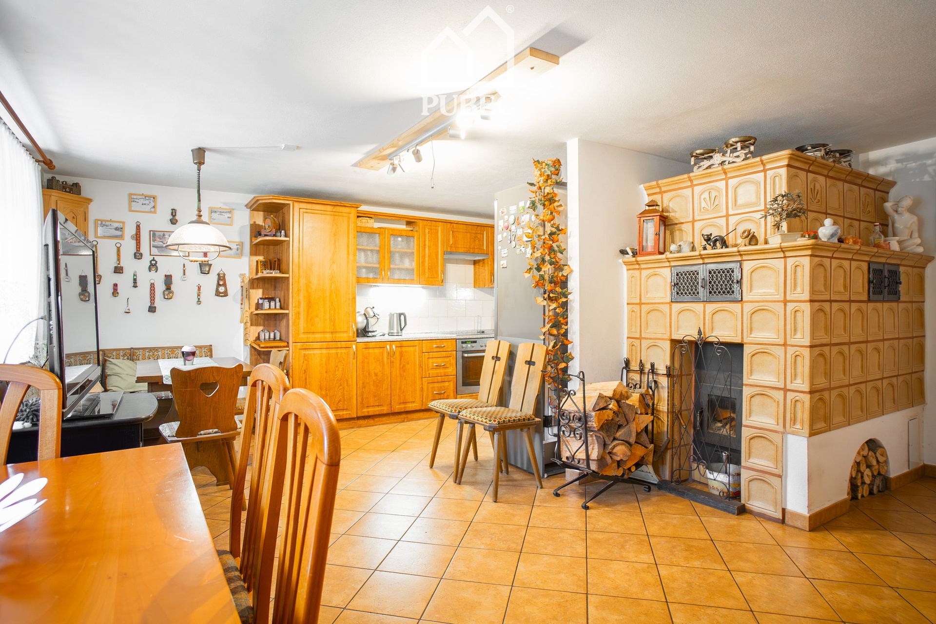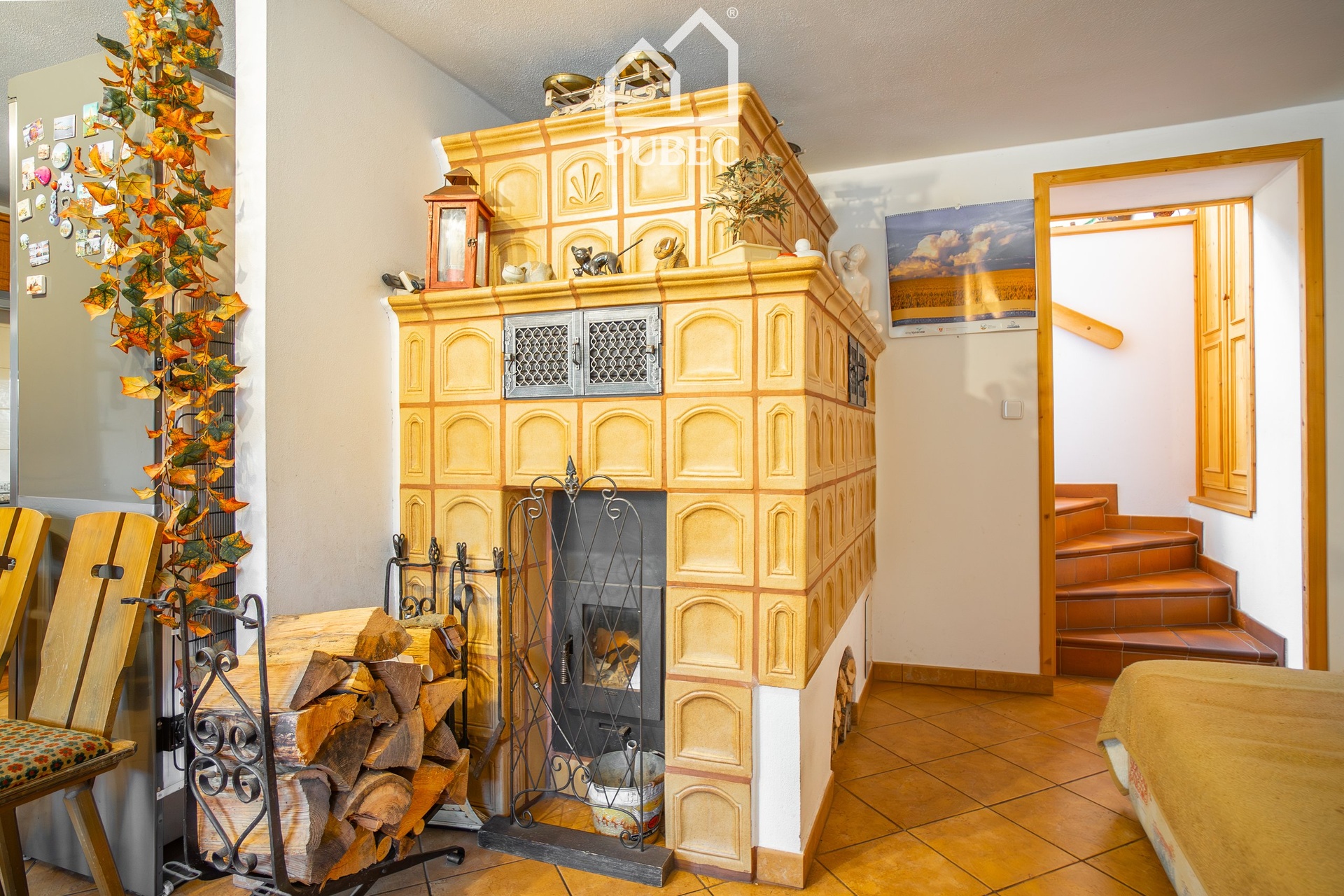 Dominantou přízemí je velkorysý obytný prostor s kuchyní a jídelnou se stylovými kachlovými kamny . Praktickou stránku doplňuje technická místnost s koupelnou, spíž a přímý vstup do garáže.