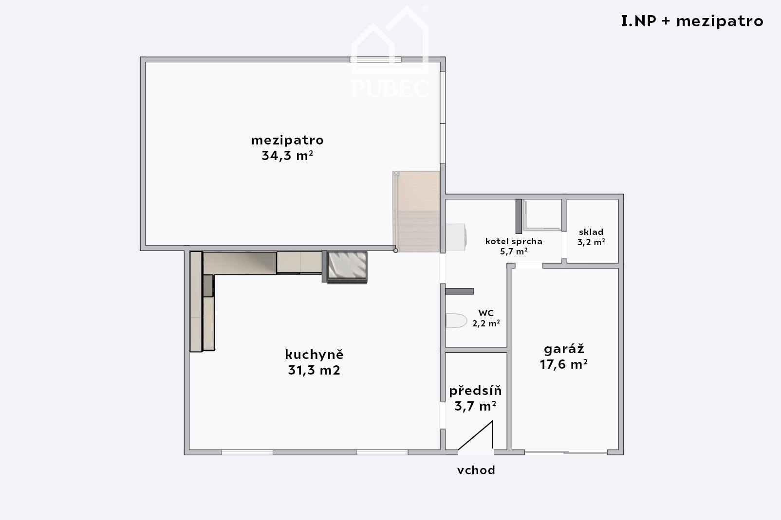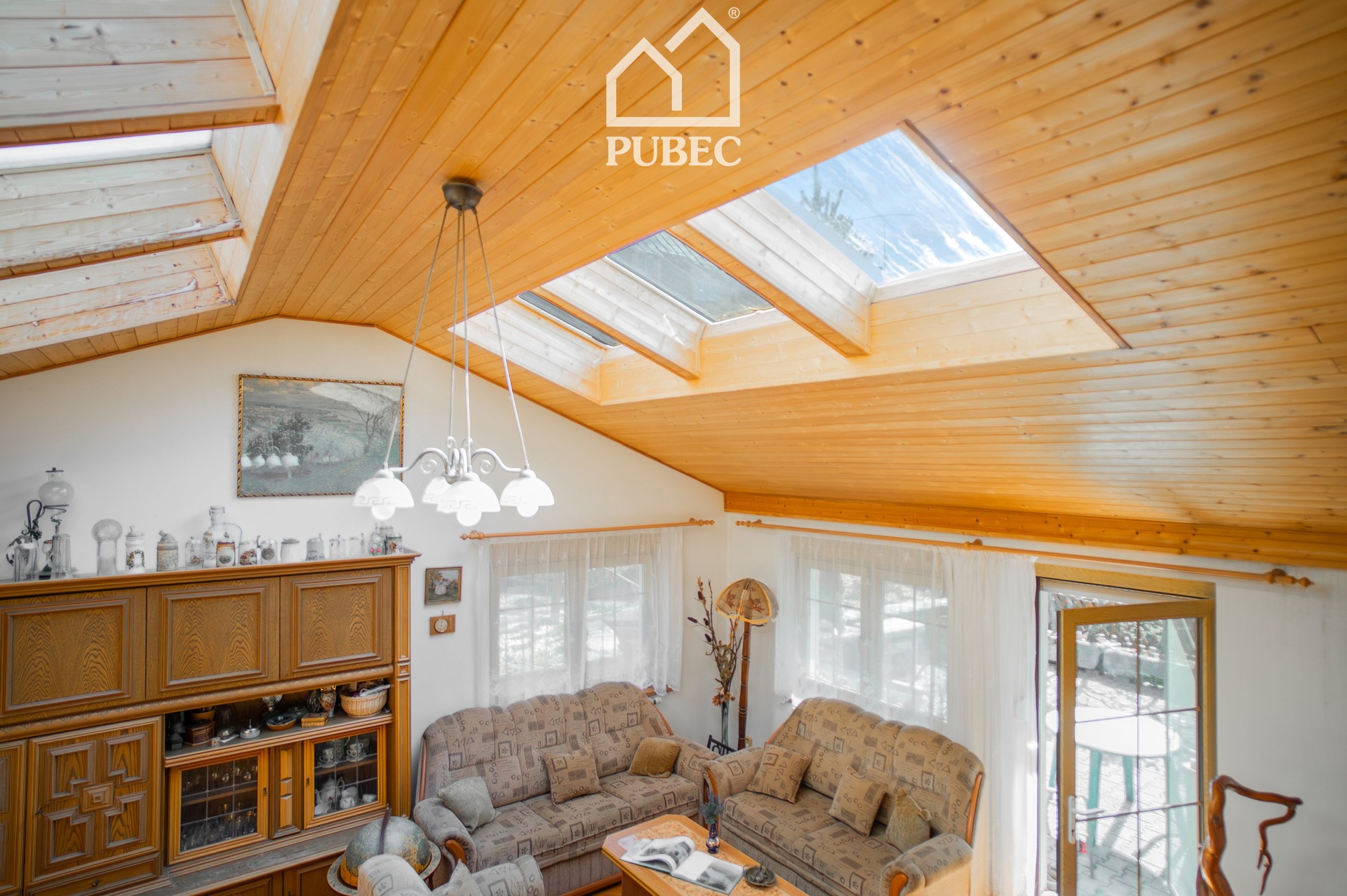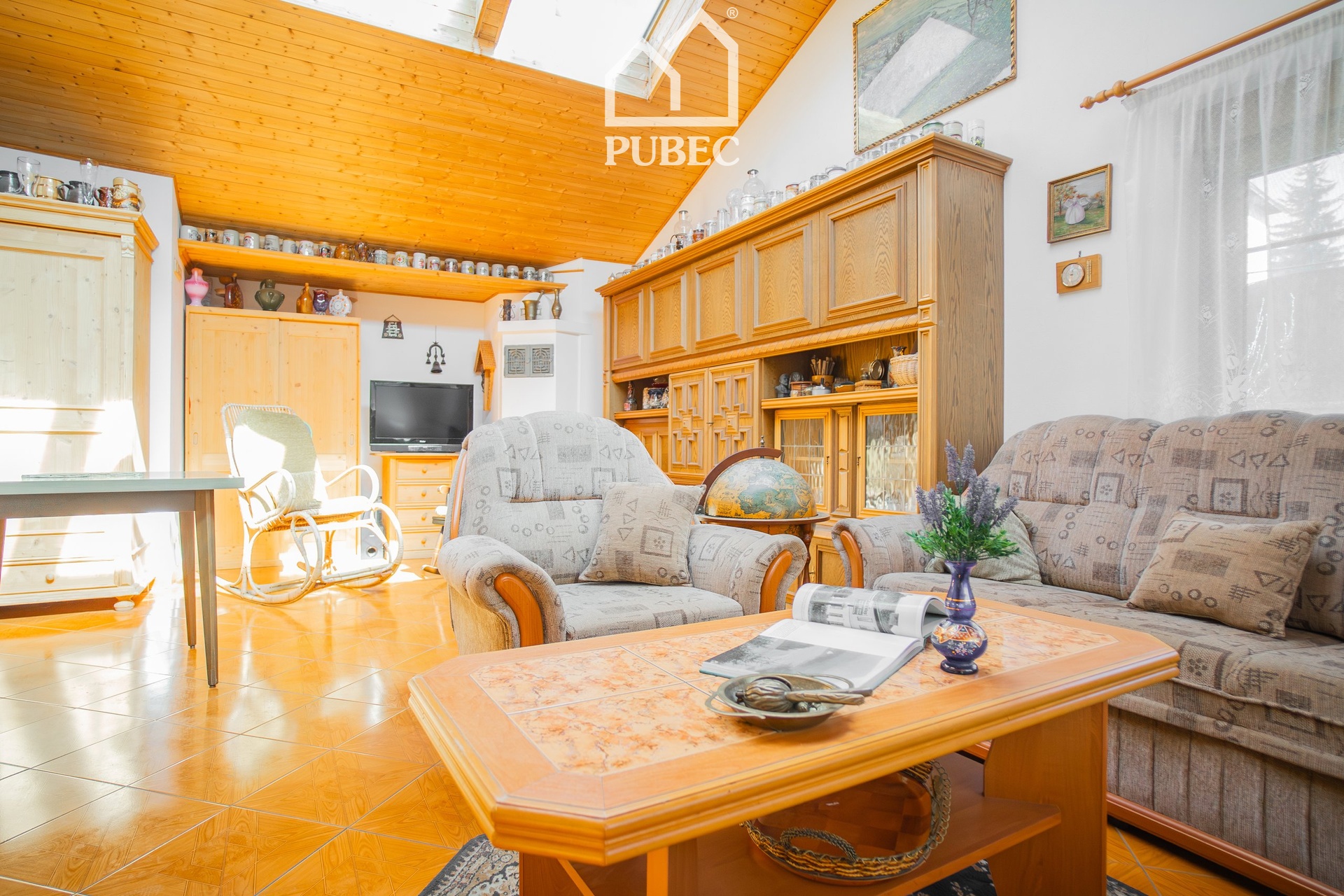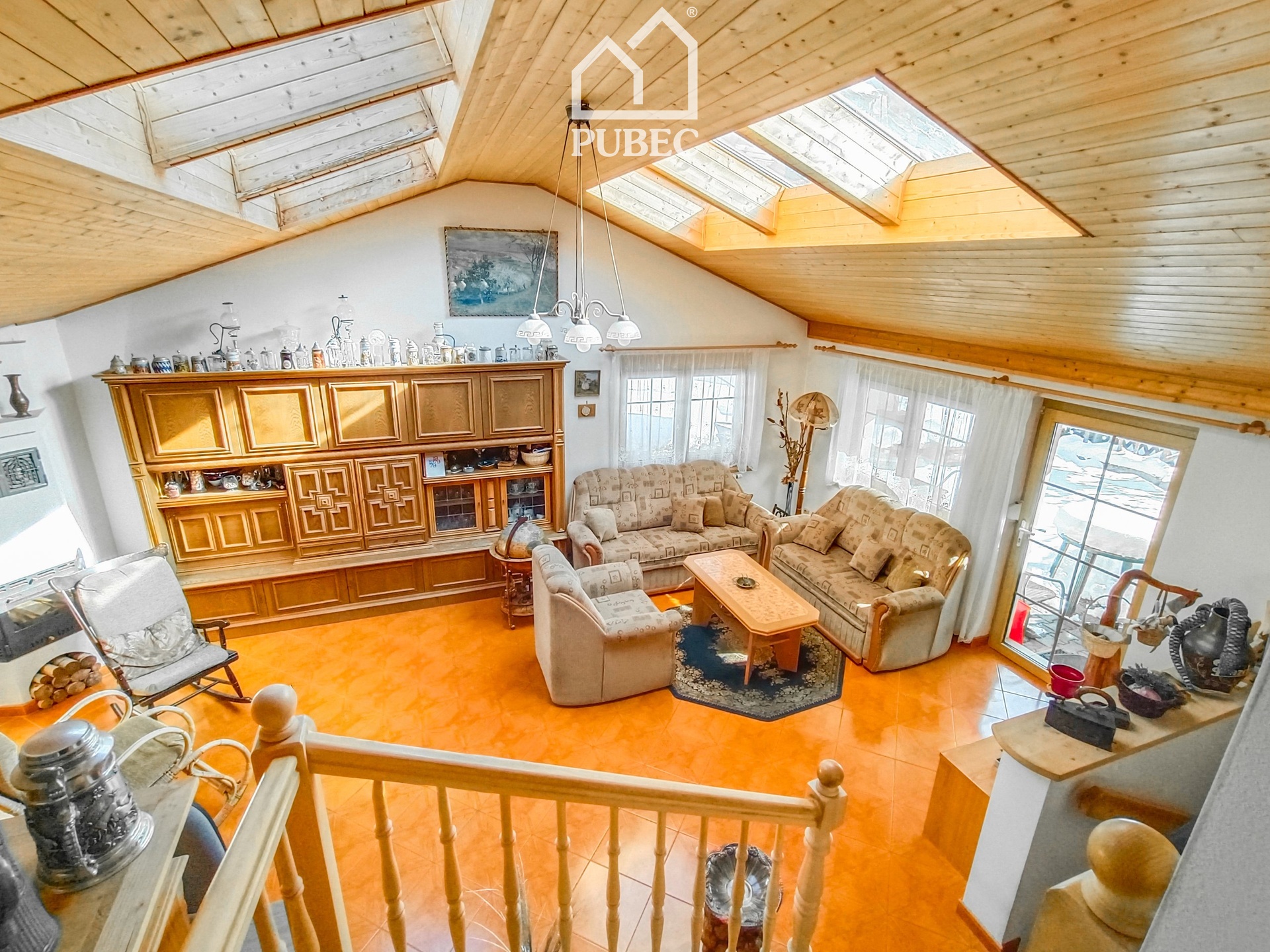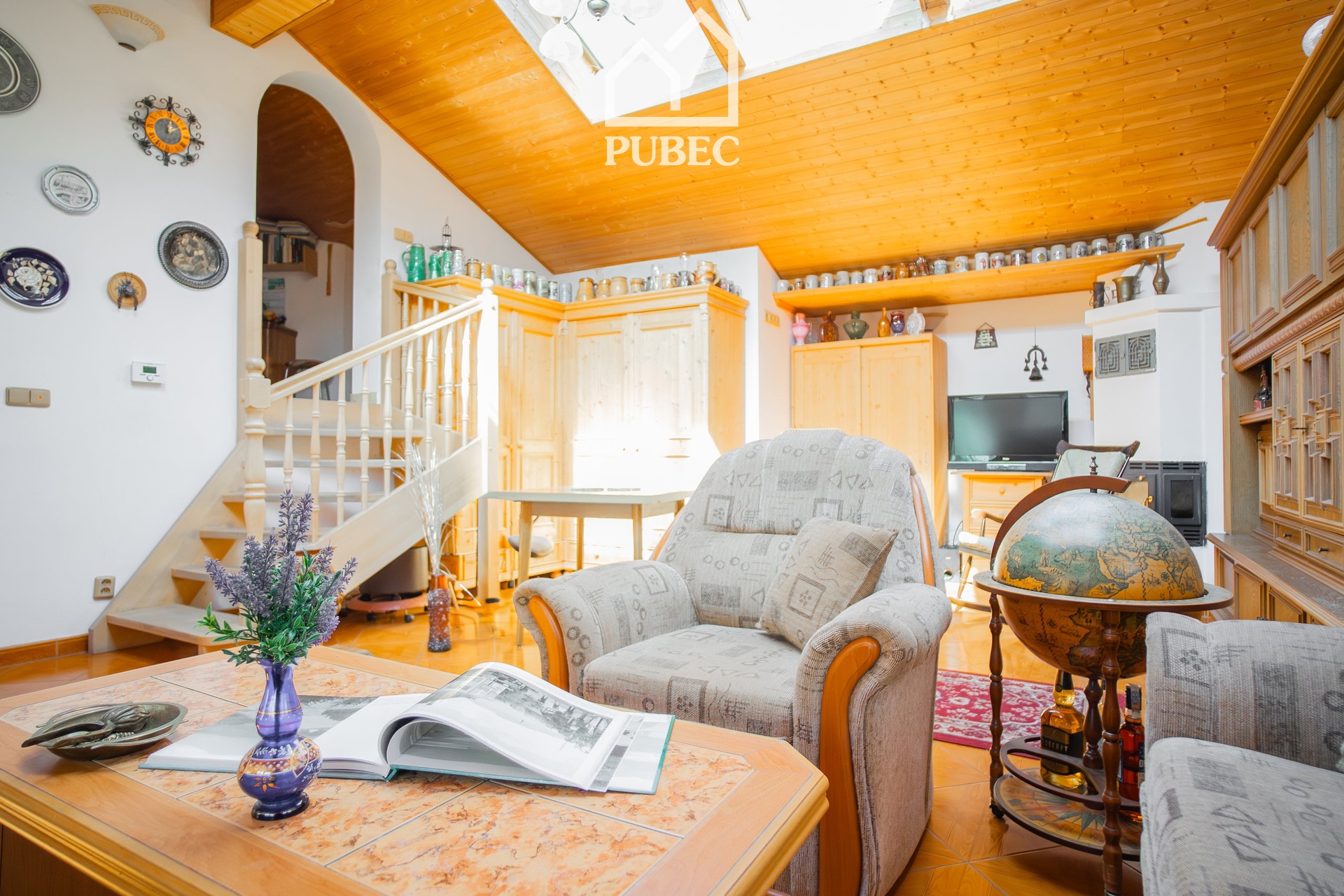 Zajímavým architektonickým prvkem je mezipatro s prostorným obývacím pokojem a prosklenou střechou, která interiér zaplavuje denním světlem a dodává domu výjimečný charakter. Nechybí ani krb, který podtrhuje celkovou atmosféru pohody.