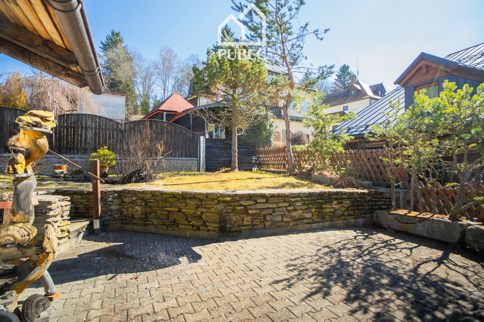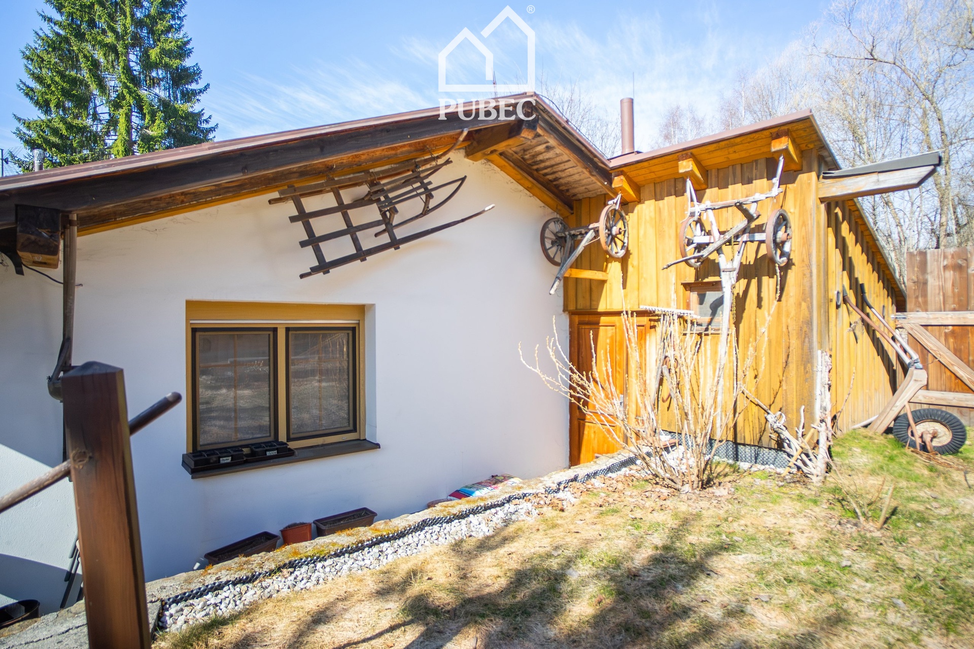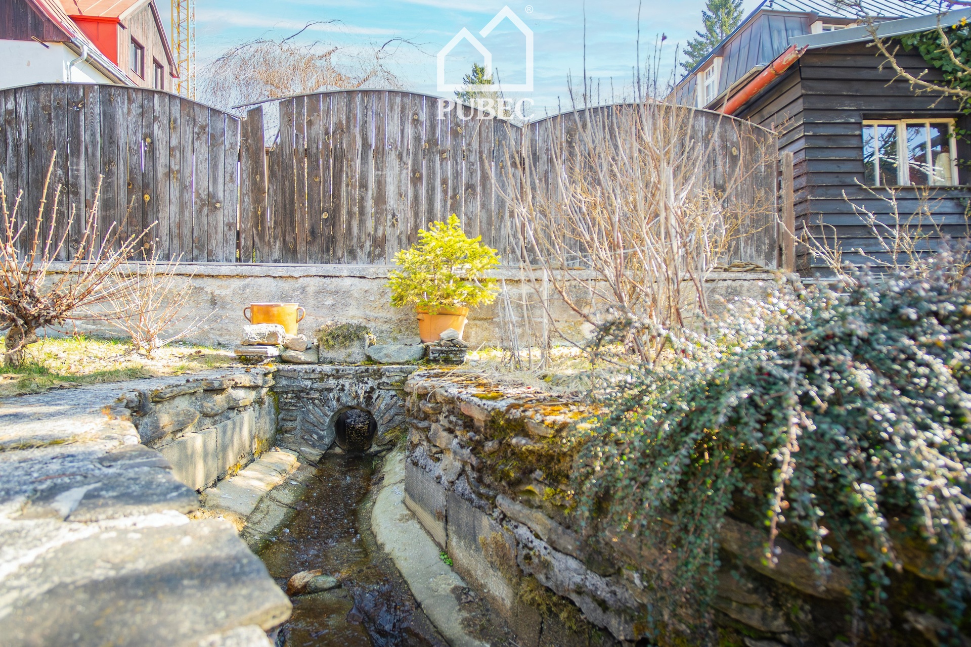 Menší kouzelnou zahradou protéká potůček, za domem najdete praktickou dřevěnou přístavbu kolny. Jižně orientovaná terasa poskytuje zázemí k příjemné posezení.