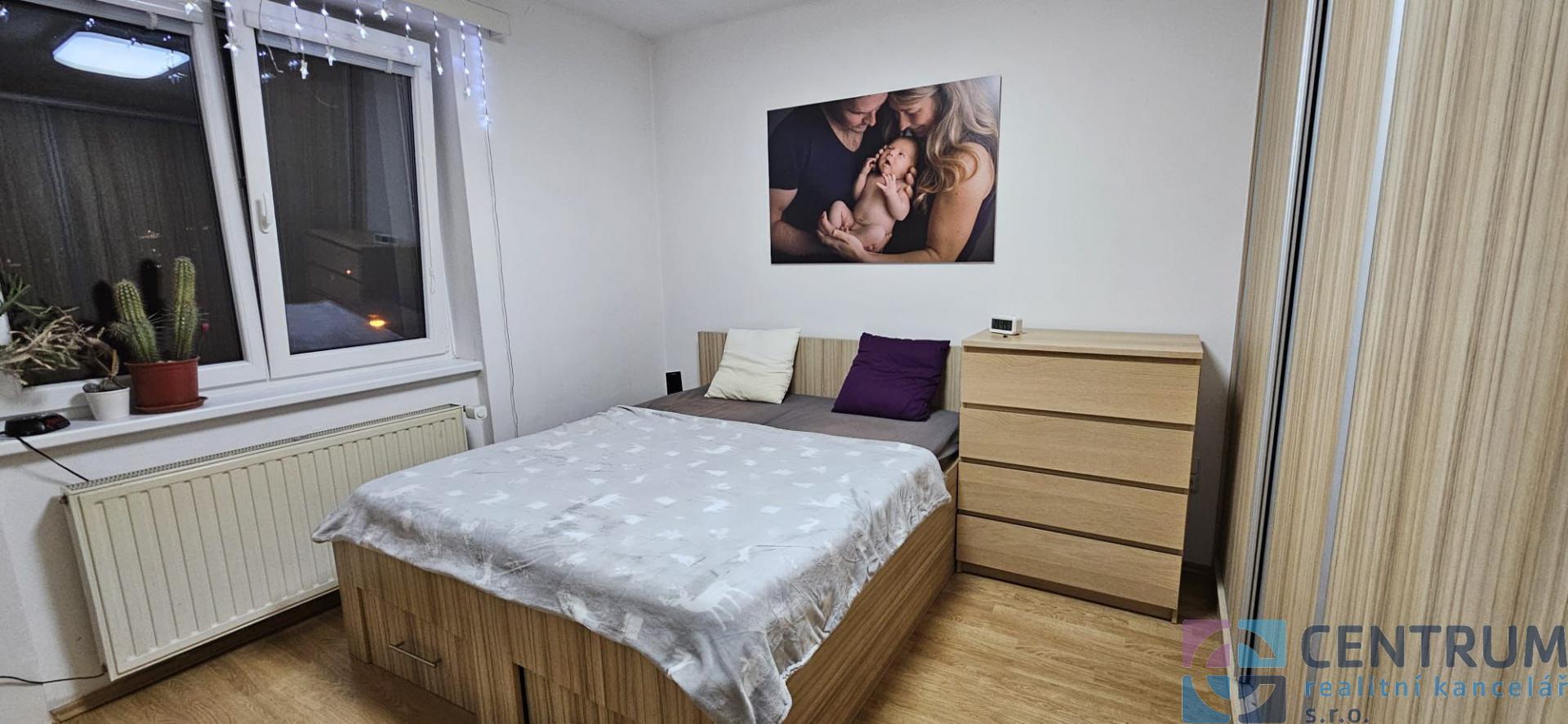 chodba s vestavěnou skříní; kuchyň - kuchyňská linka vč. kombinovaného sporáku vč. digestoře, myčka nádobí; obývací pokoj se vstupem na lodžii; ložnice vč. vybavení - manželská postel bez matrací, 2x vestavěná skříň; dětský pokoj; zděná koupelna s vanou a místem na pračku i sušičku; samostatná toaleta; v bytě jsou plovoucí podlahy a dlažba ( chodba, koupelna a toaleta ), plastová okna.