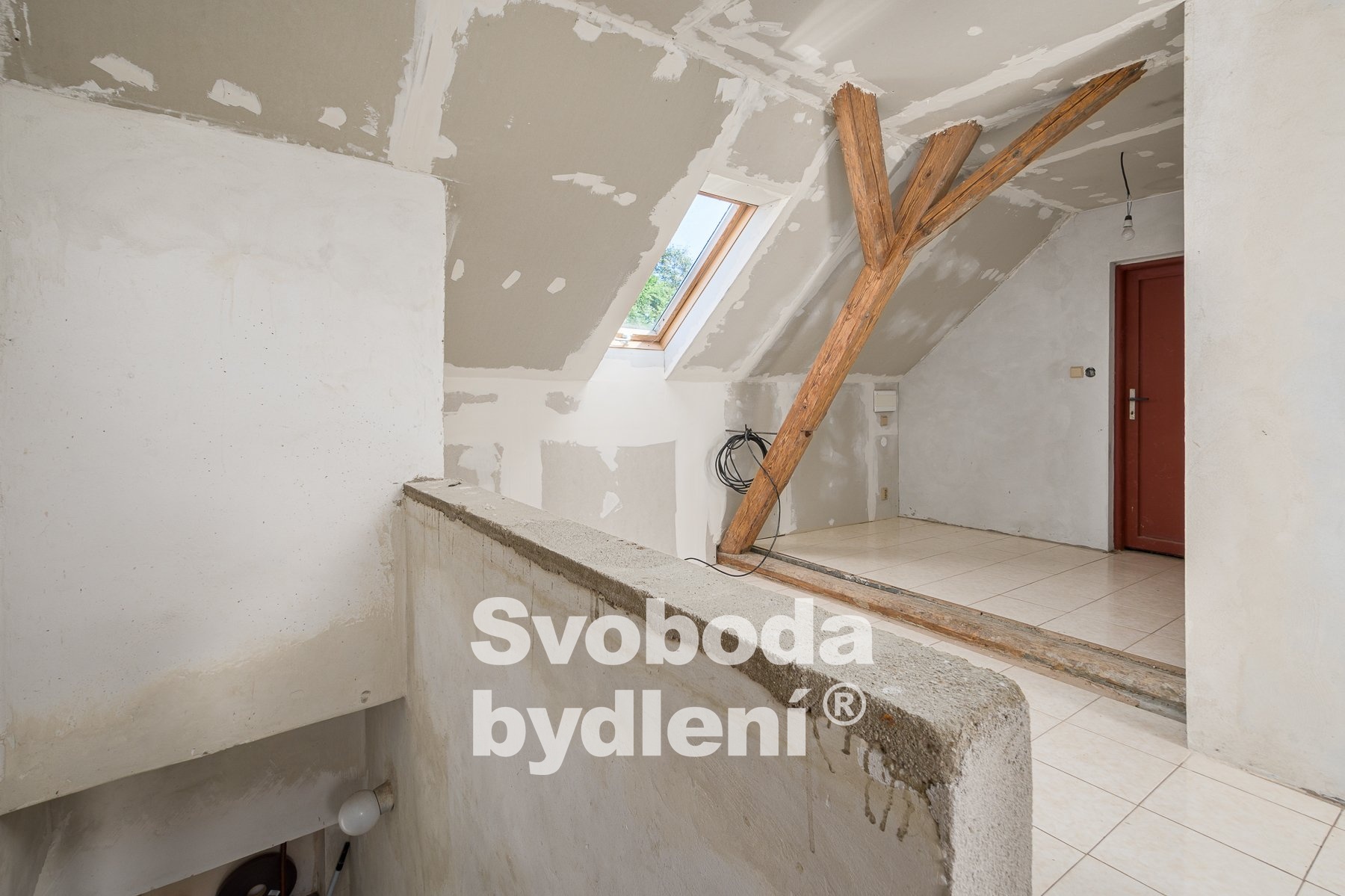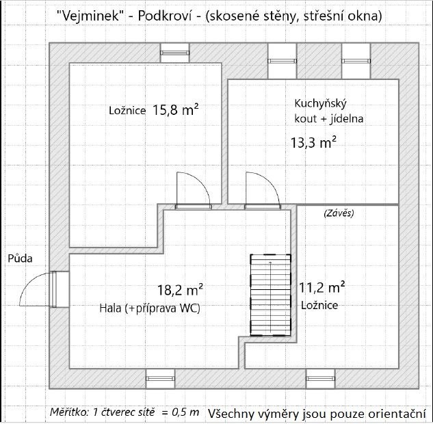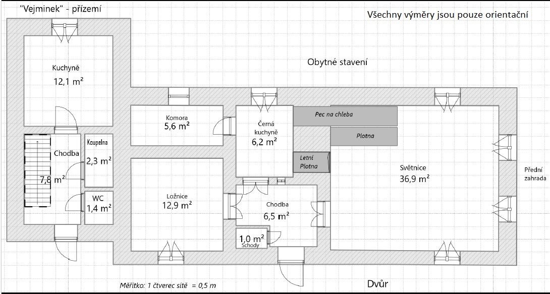 Vejminek s podkrovím (celkem cca 82m2) s dispozicí 3+kk byl připravován také na bydlení, práce v podkroví jsou započaty. V přízemí se nachází předsíň a jedna obytná místnost (12 m2), dále je zde samostatné WC a koupelna se sprchovým koutem. Po dřevěných schodech se dostáváme do podkroví 2. NP, kde jsou dvě samostatné místnosti (25, resp. 15 m2), ve větší z nich je kuchyňská linka s dřezem. U schodů je společný otevřený prostor, který může sloužit jako obývací pokoj. Je zde i vstup na další půdu. Plocha této části budovy je v 1. NP cca 24 m2 a ve 2. NP cca 58 m2. Půda, přístupná ze 2. NP, má plochu cca 85 m2.