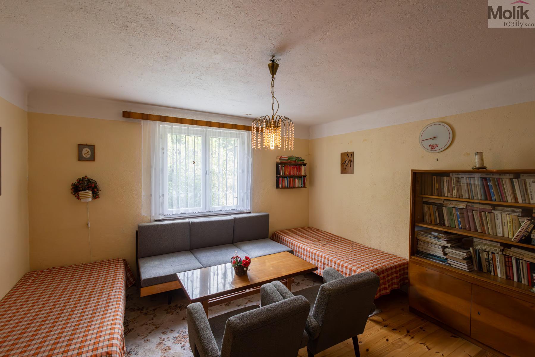 V domě se nachází 3 pokoje, kuchyň a obývací pokoj s krbem.