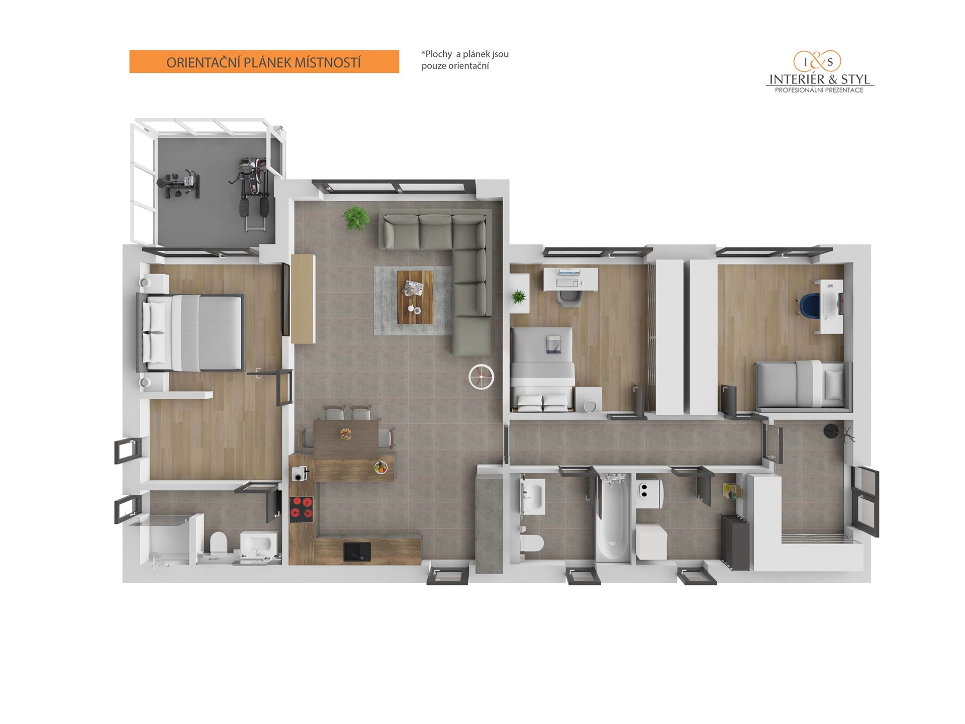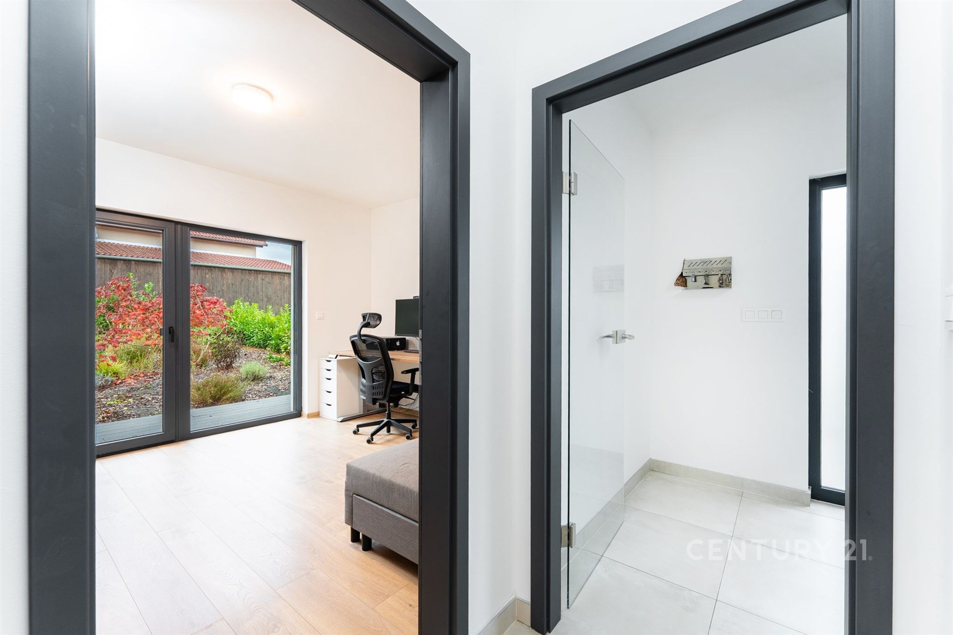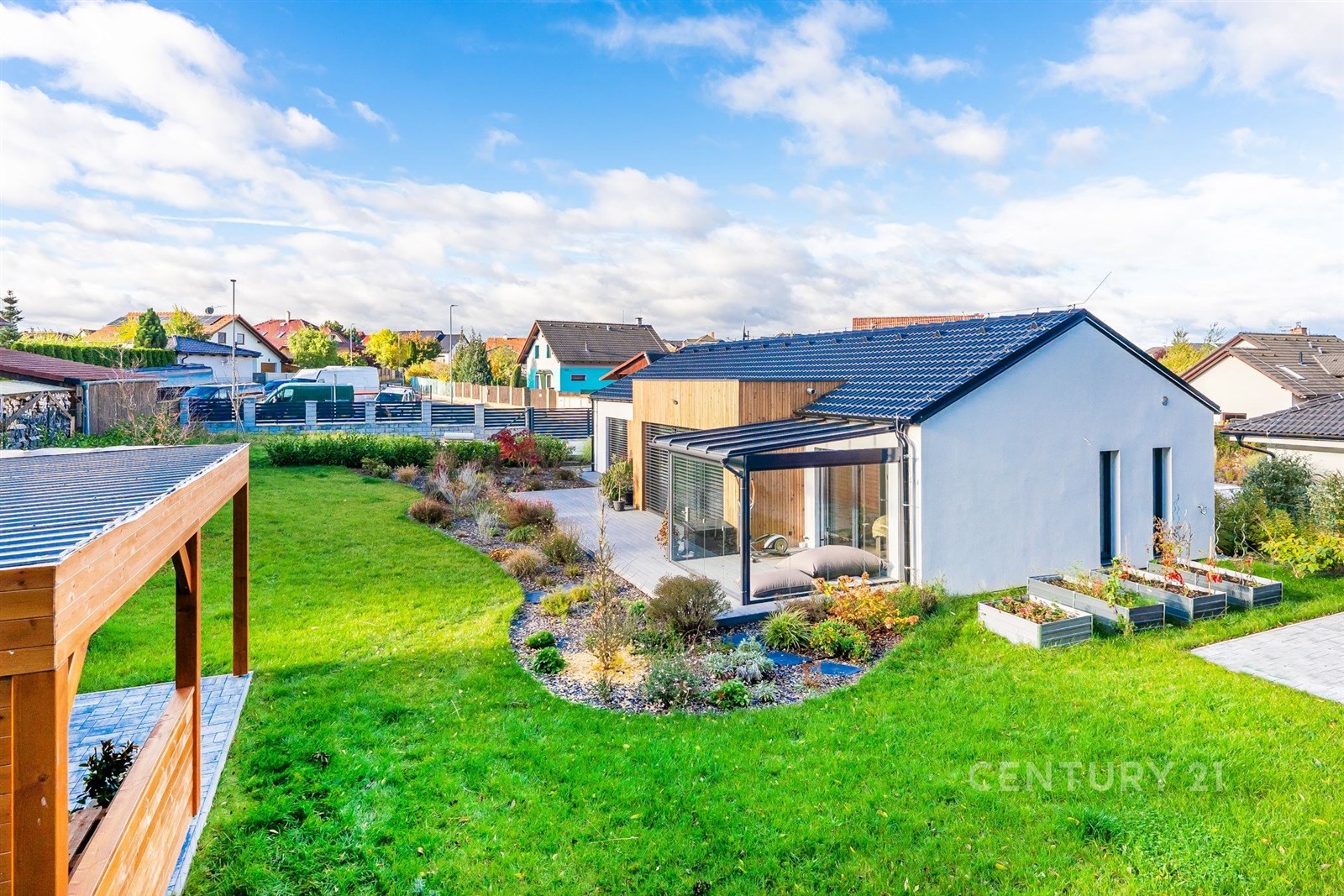 Dominantou je obývací pokoj s kuchyní, který představuje živé srdce domu, ideální pro rodinná setkání i klidné večery. Dům disponuje třemi oddělenými pokoji, dvěmi koupelnami s toaletou a technickou místností. Uzavřené prosklené atrium poskytuje prostor pro odpočinek po celý rok, zatímco terasa zve k posezení na čerstvém vzduchu.