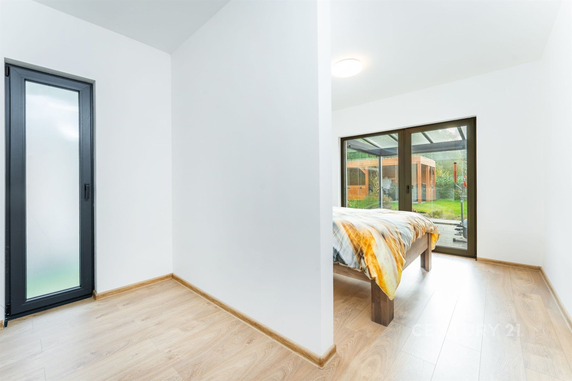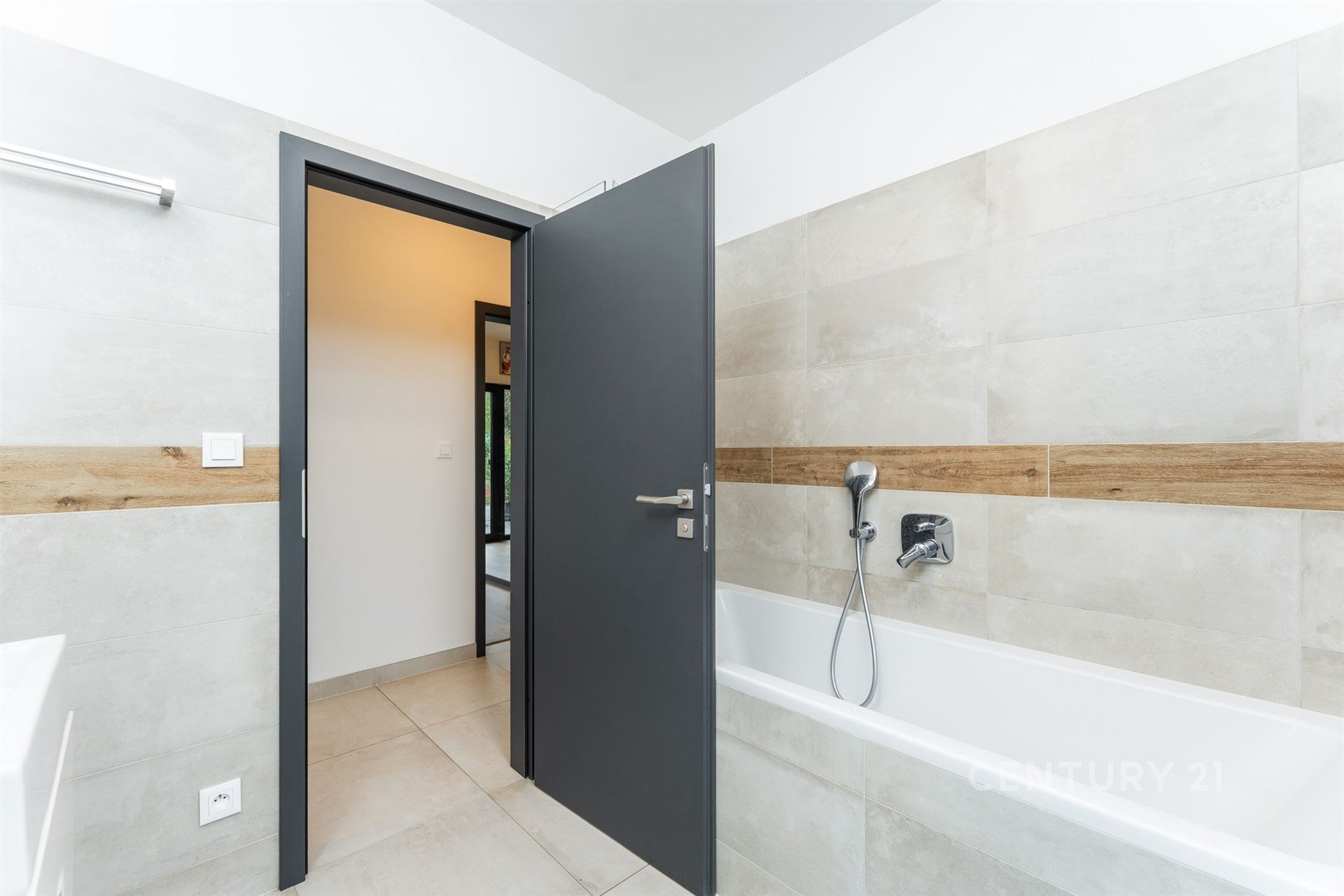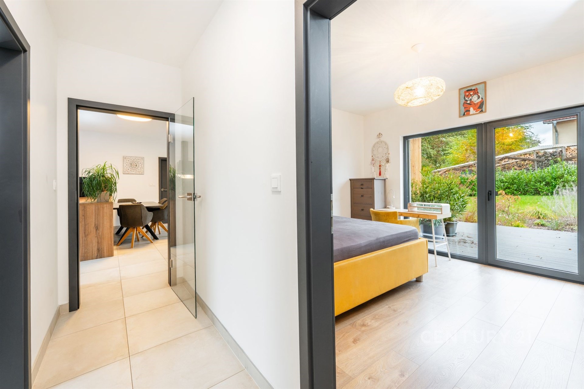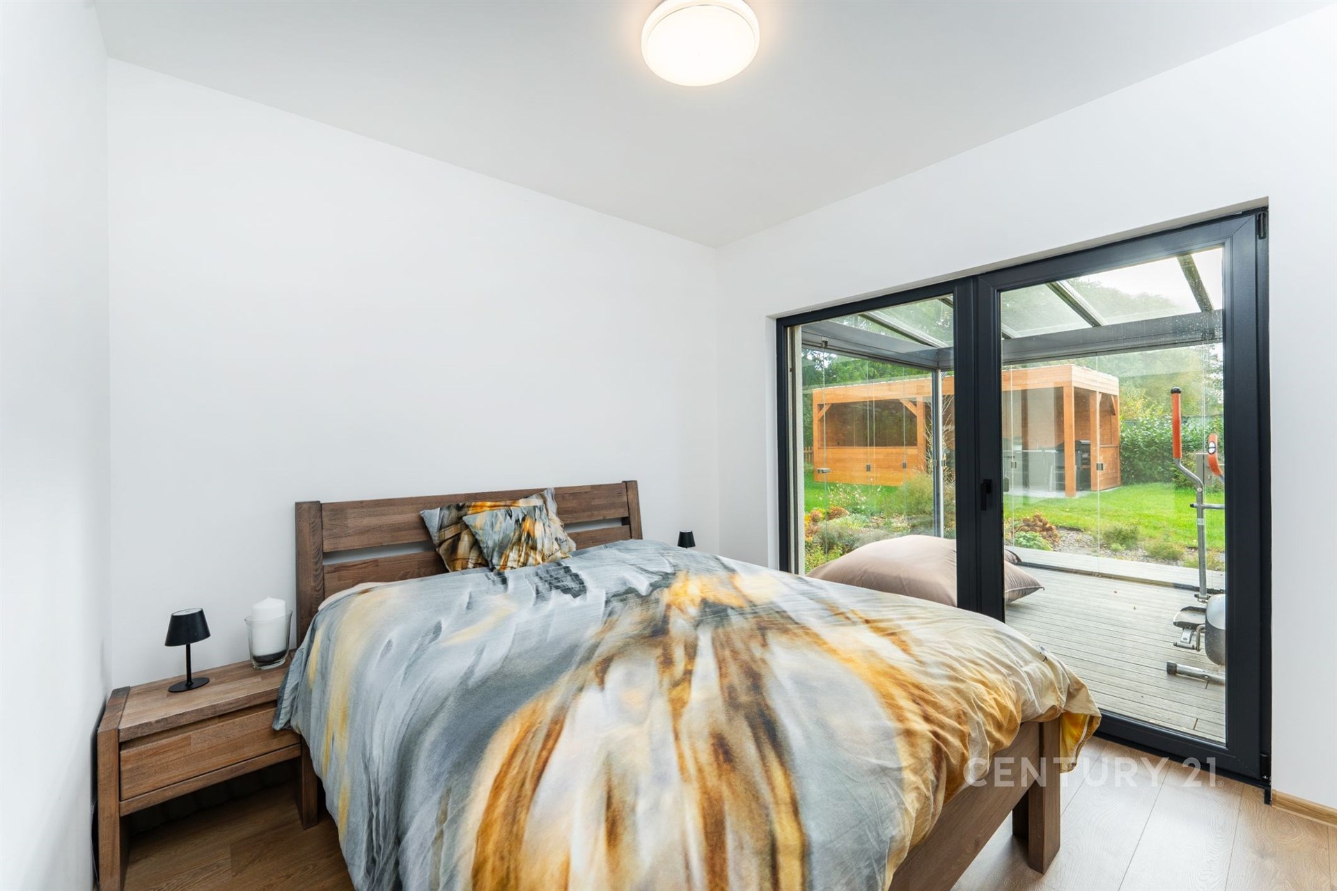 Velkorysá okna poskytují dechberoucí pohled do zeleně v okolí domu a z prostorné terasy lze vychutnat klidné prostředí s dostatkem soukromí. Každý detail domu byl navržen tak, aby vytvářel pocit volnosti, pohodlí a přirozeného propojení interiéru s exteriérem.