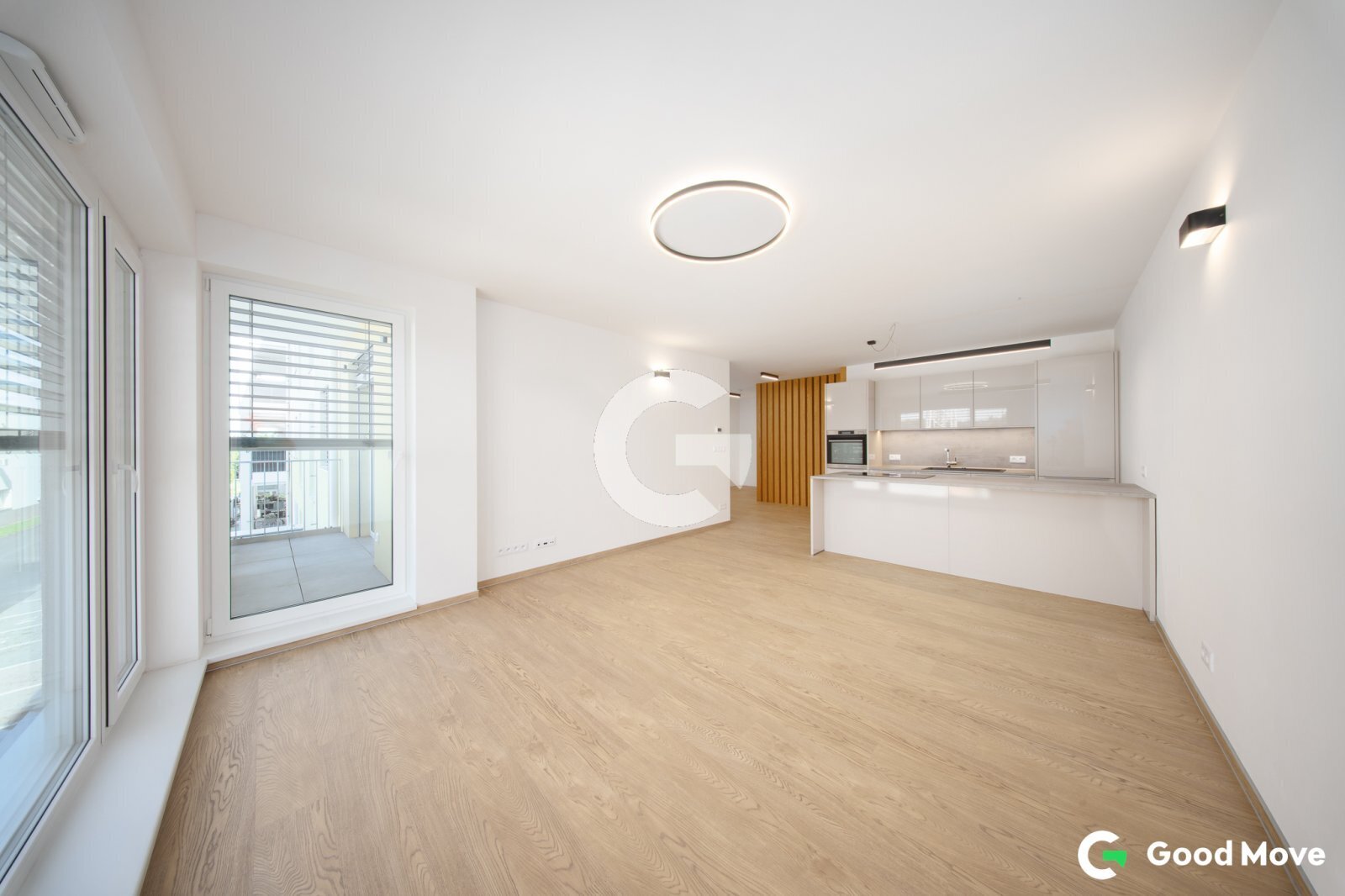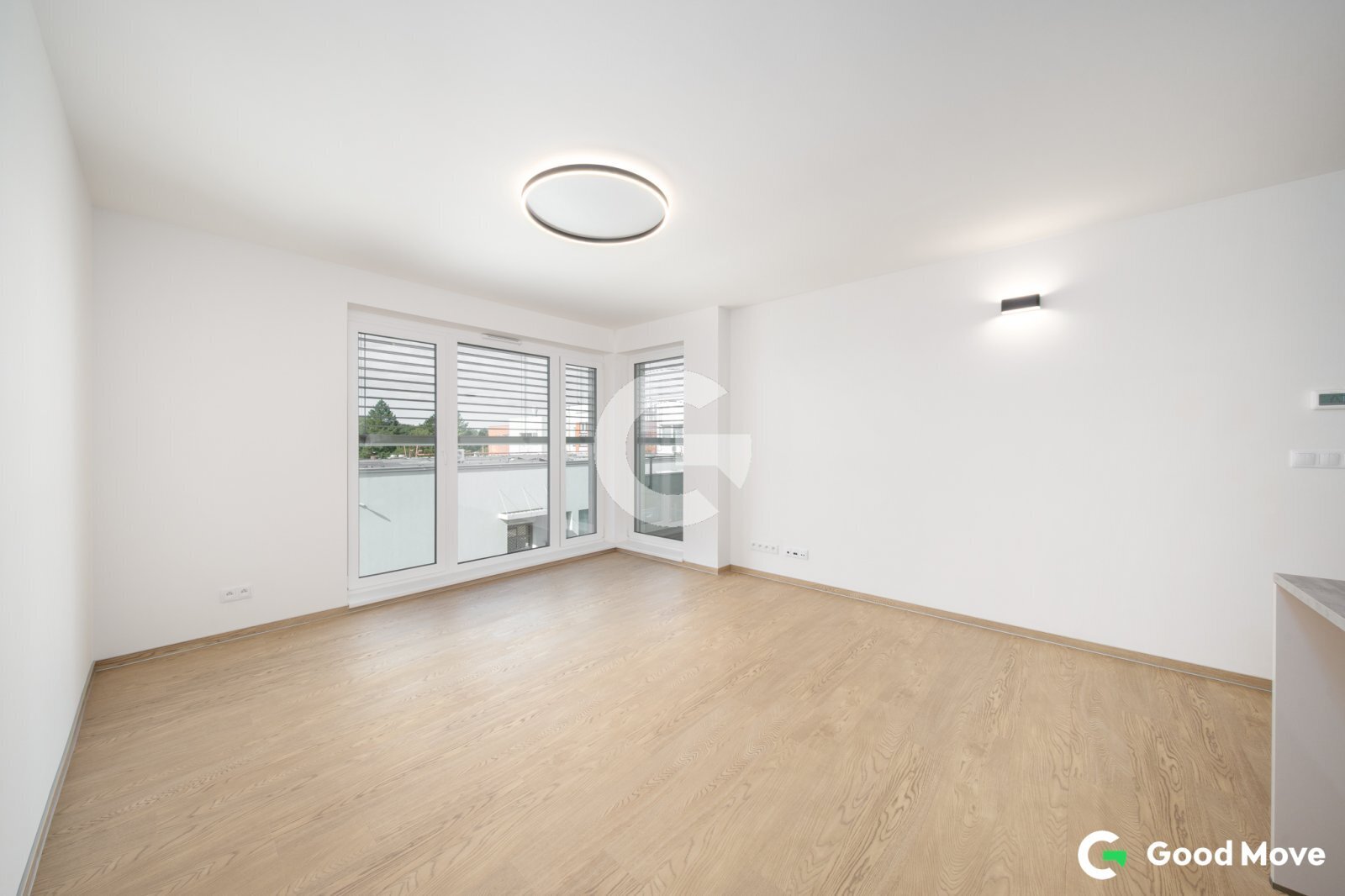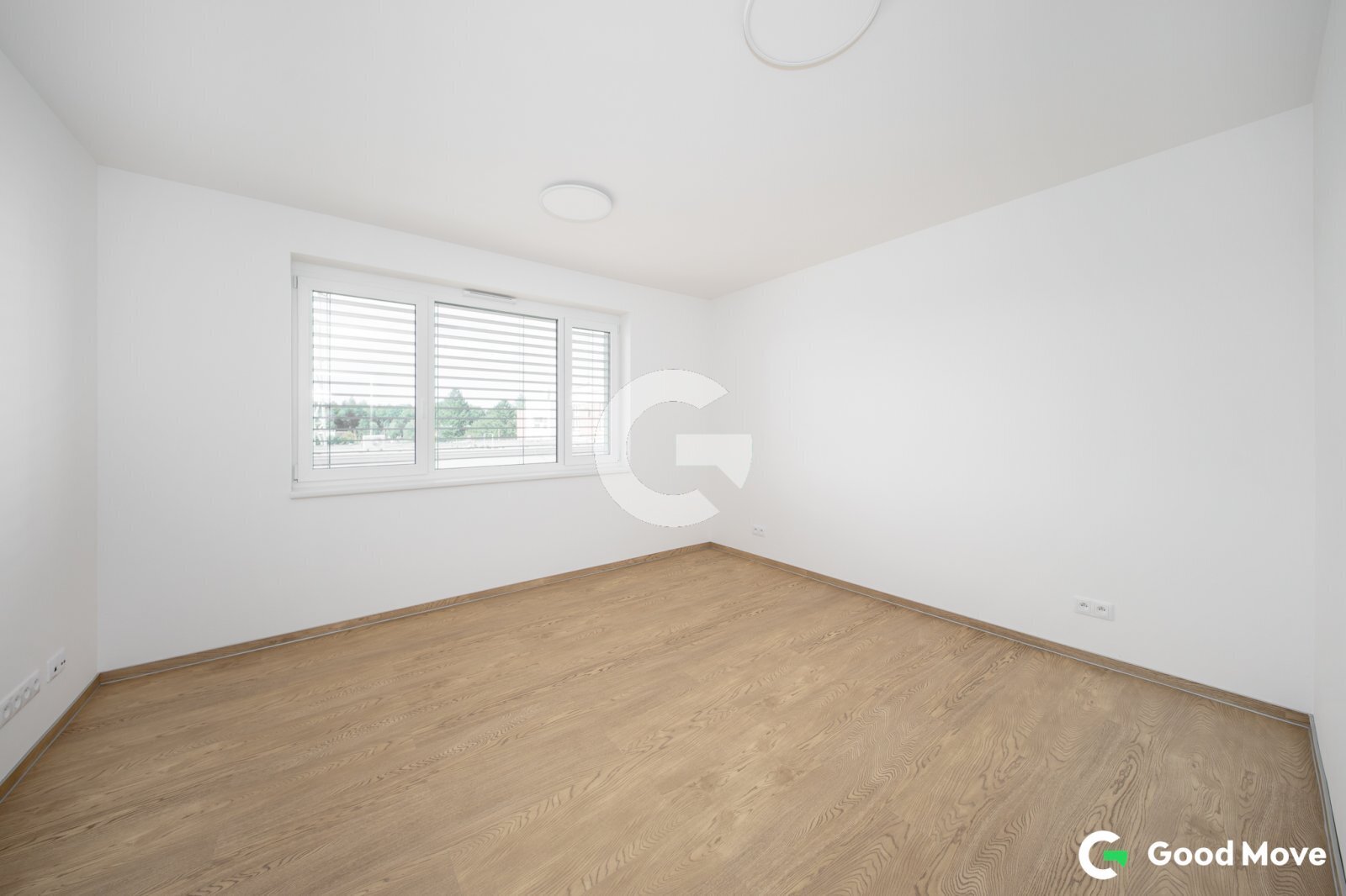 Obývací pokoj je prosvětlený díky velkému francouzskému oknu, které propojuje interiér s exteriérem a přináší do bytu dostatek denního světla. Všechna okna jsou vybavena venkovními žaluziemi, které umožňují regulaci světla i teploty a přispívají k příjemnému klimatu v bytě.