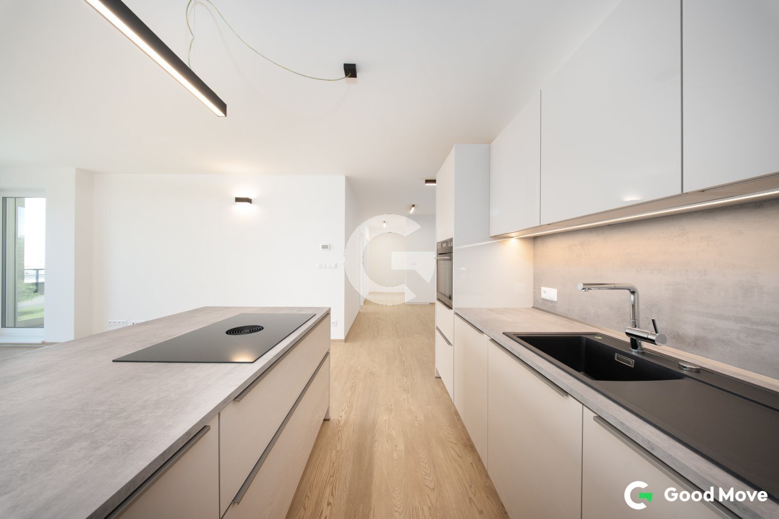 Interiér bytu byl v rámci klientských změn doplněn o řadu nadstandardních prvků, které posouvají úroveň bydlení na vyšší standard. Dominantou obytného prostoru je moderní kuchyňská linka vyrobená na míru od renomované společnosti Minár, vybavená vestavnými spotřebiči AEG a designovou indukční varnou deskou Bora. Celkový dojem prostoru podtrhuje elegantní dřevěná stěna na míru, která dodává interiéru charakter i útulnost.