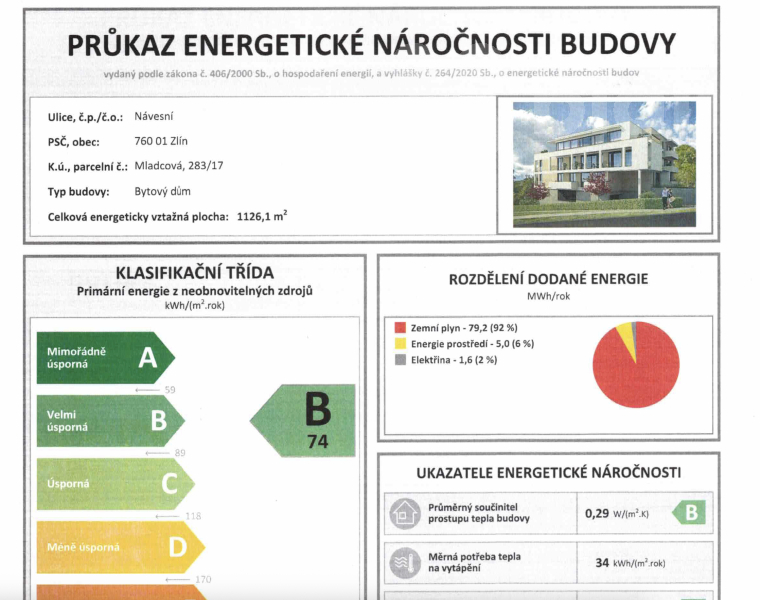 Každý z bytů v projektu "Byty na Mladcové" reprezentuje spojení vyššího standardu a kvalitních materiálů, které zajišťují nejen komfort, ale i dlouhodobou hodnotu bydlení. Bytový dům disponuje energetickou třídou B - což nejen snižuje provozní náklady pro majitele, ale zároveň podtrhuje vizi dlouhodobé udržitelnosti.