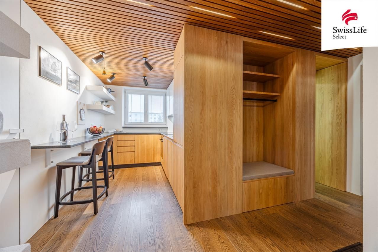 K bytu náleží prostorný sklep, kam se pohodlně vejde kolo, sportovní vybavení i sezónní věci. Cena bytu je včetně vybavení zhotoveného na míru, které bylo navrženo přímo pro tento prostor a tvoří jeho přirozenou součást.