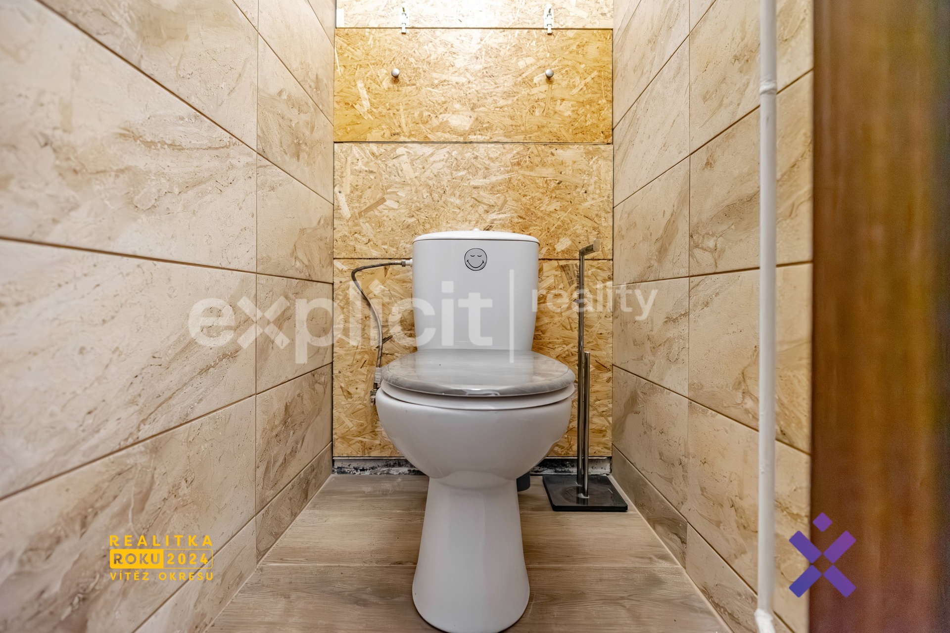 Koupelna je zděná, vybavená vanou a prostorem včetně přípojky pro pračku. WC je samostatné a rovněž zděné.