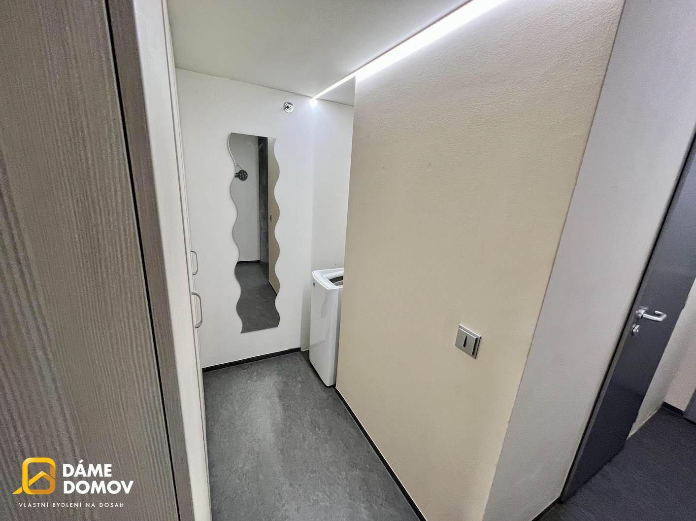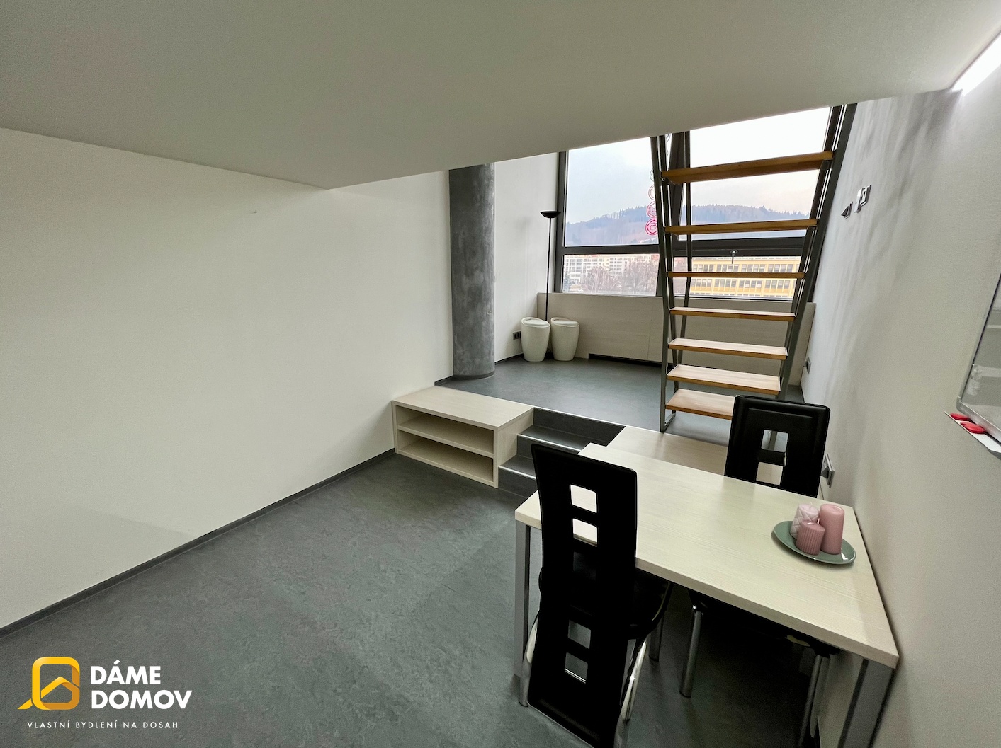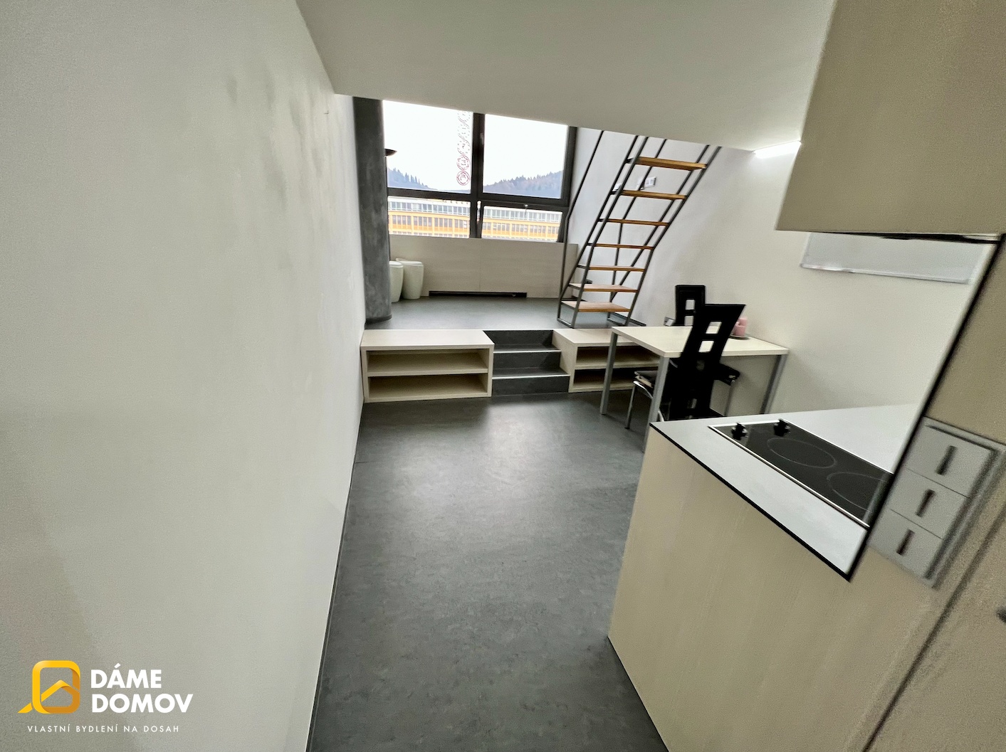 Byt je loftový a je dispozičně řešen jako 2+kk, kdy ve spodní části bytu je koupelna, šatna, kuchyň, obývací pokoj a v horní části pak ložnice s části pro pracovnu a vestavěné skříně.