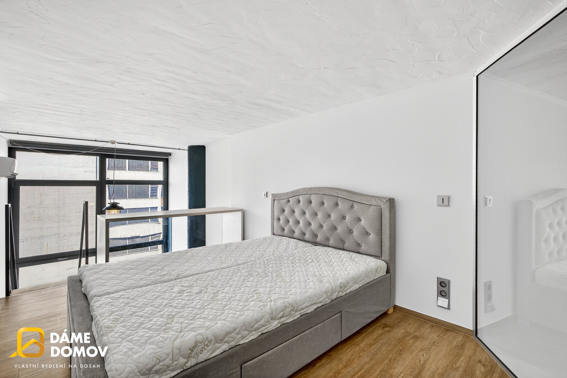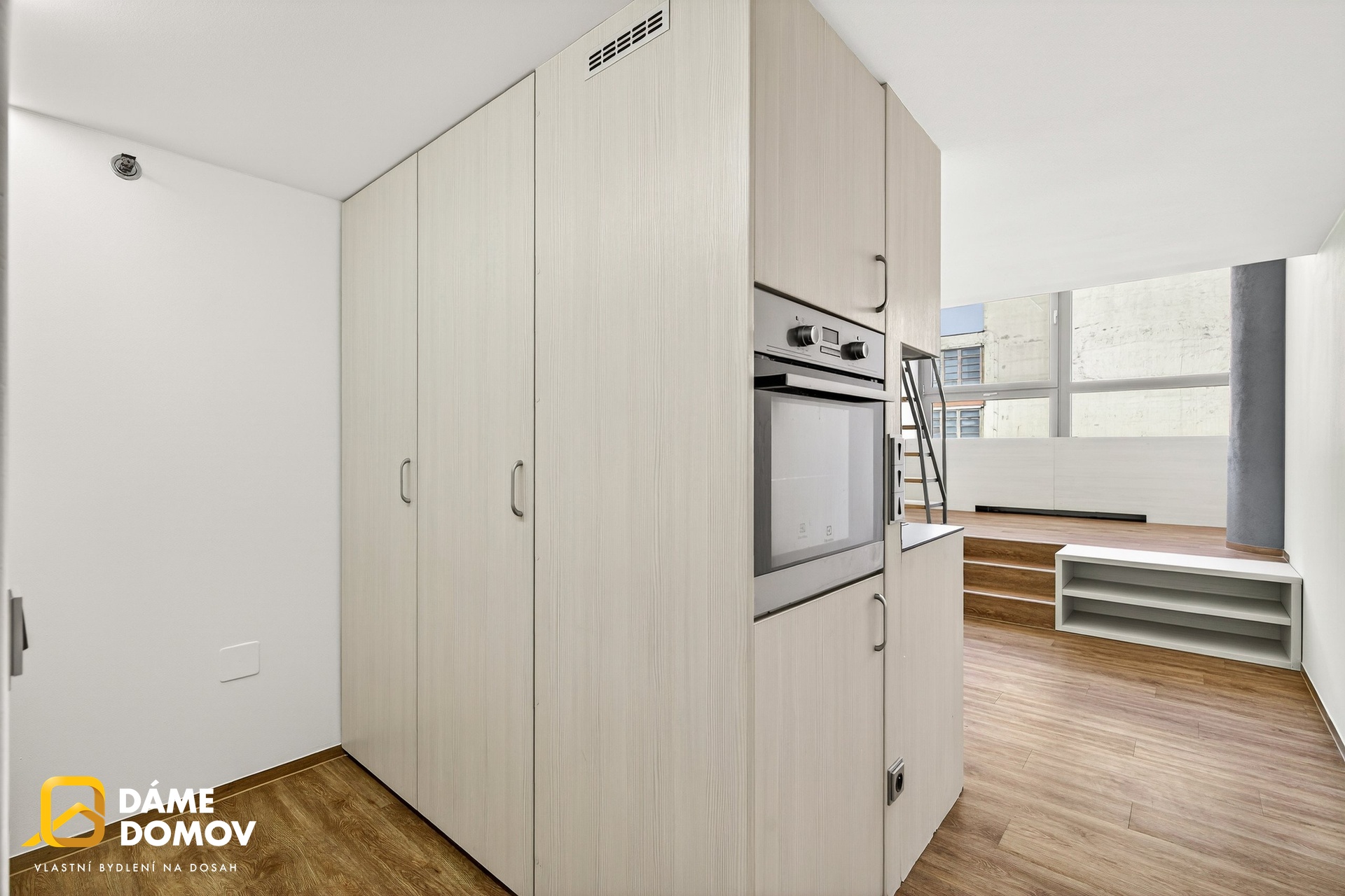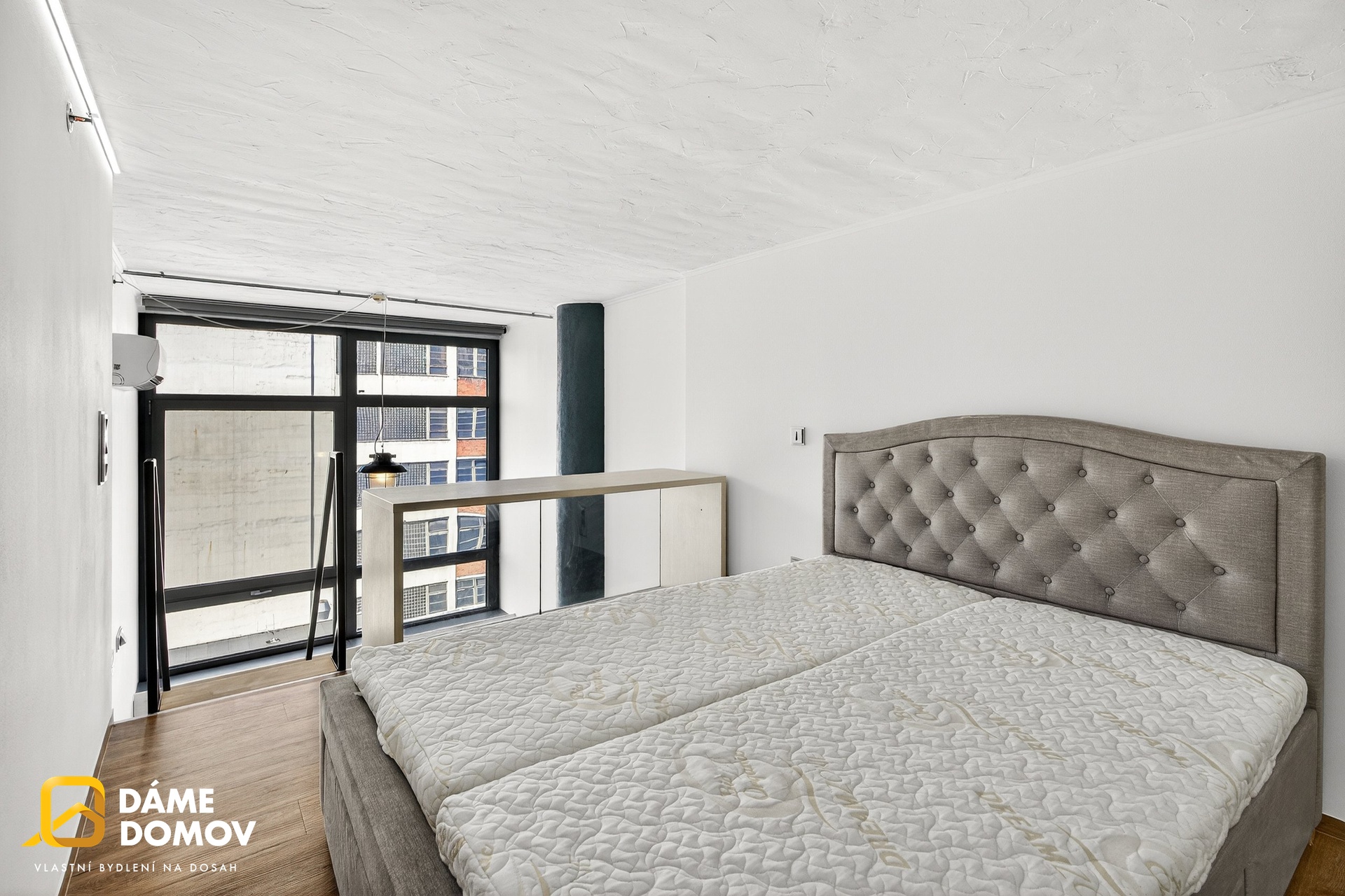 Byt je loftový a je dispozičně řešen jako 2+kk, kdy ve spodní části bytu je koupelna, šatna, kuchyň, obývací pokoj a v horní části pak ložnice s části pro pracovnu a vestavěné skříně.