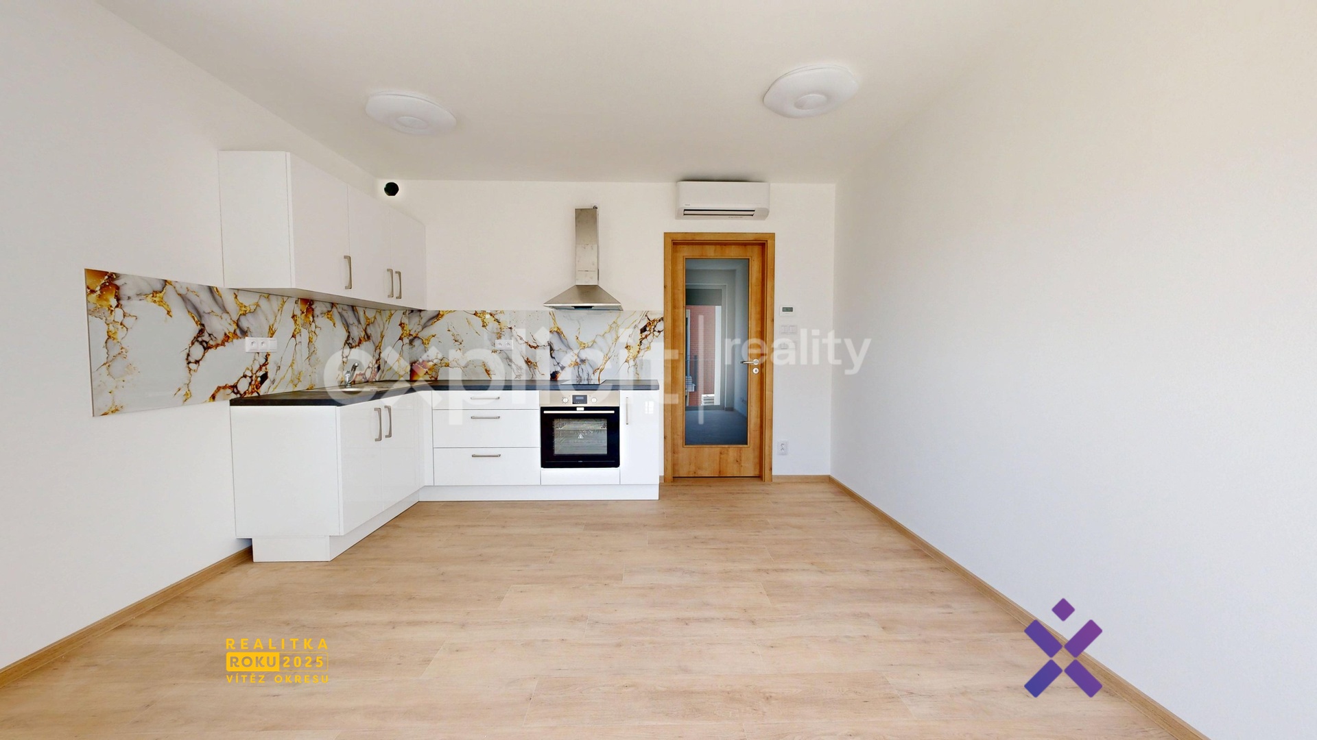 Obytná místnost s kuchyňským koutem je vybavena kuchyňskou linkou s troubou, elektrickou varnou deskou a digestoří. V zádveří se nachází praktická vestavěná šatní skříň. Koupelna disponuje sprchovým koutem, toaletou a přípravou na připojení pračky a sušičky. O příjemné klima v bytě se stará podlahové vytápění a klimatizační jednotka.