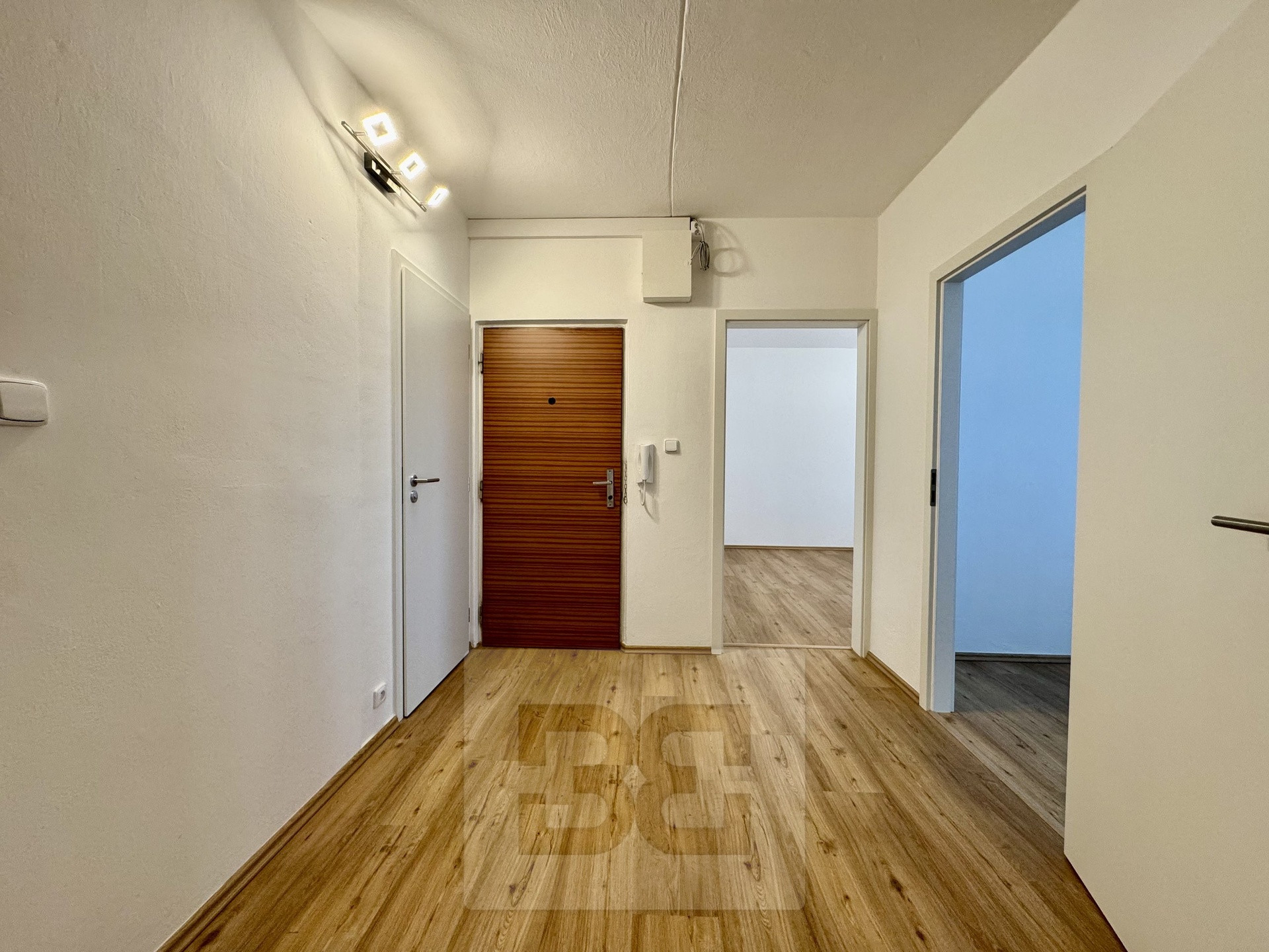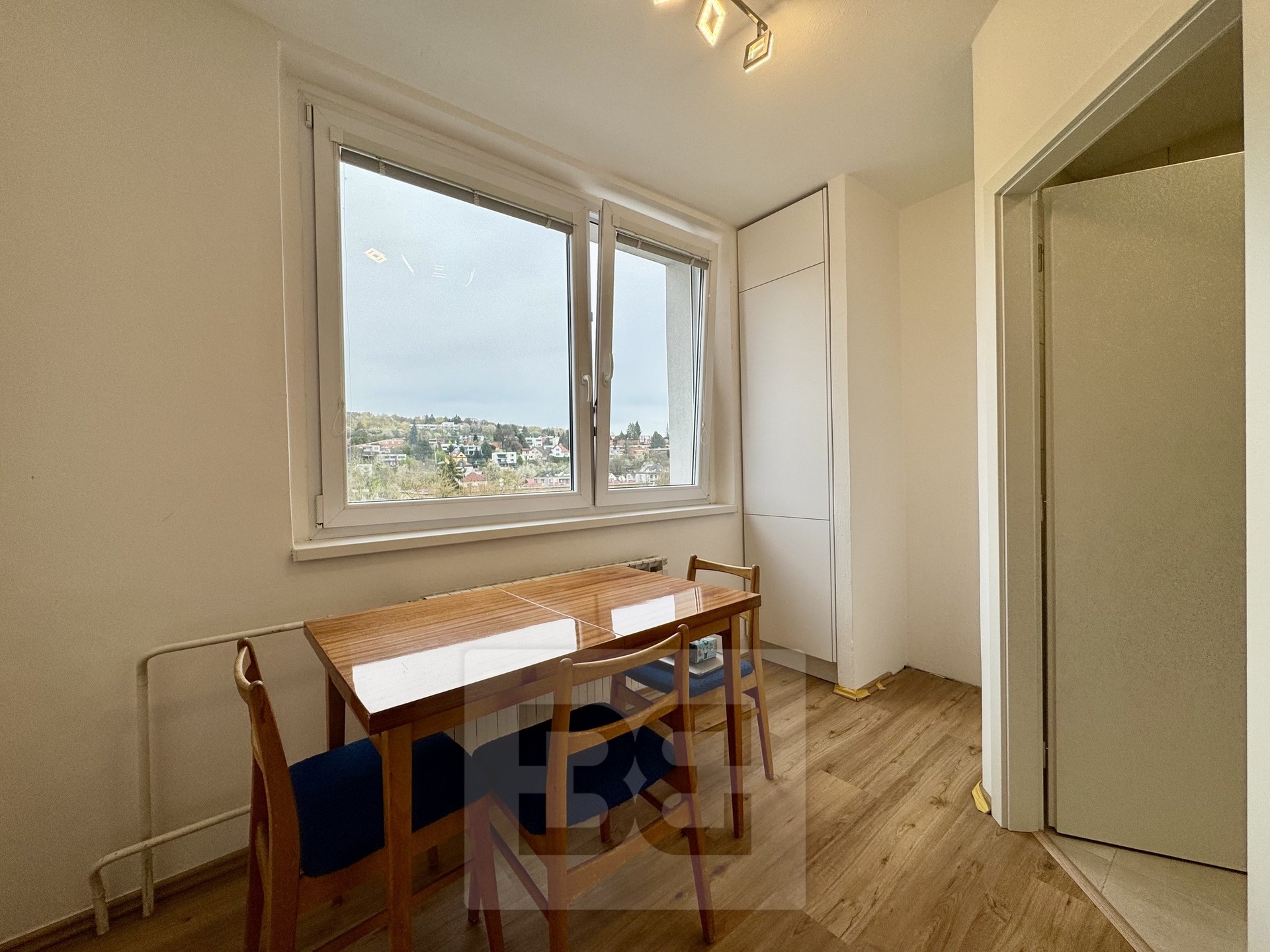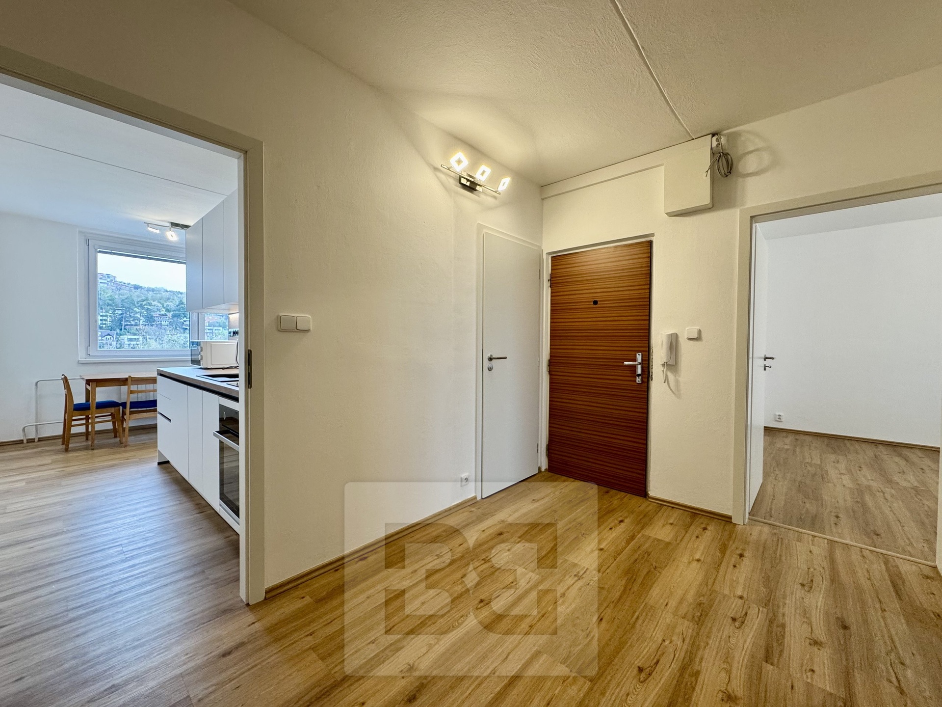 Dispozice bytu tvoří prostorná předsíň s dostatkem úložného prostoru, dva samostatné pokoje, přičemž jeden z nich má přímý vstup na balkon s příjemným výhledem. Dále je k dispozici nová kuchyně vybavená vestavěnými spotřebiči – myčka, varná deska, trouba, digestoř a mikrovlnná trouba, nechybí ani jídelní stůl se židlemi. Koupelna je moderní a vkusně řešená, toaleta je samostatná a doplněná umyvadlem.