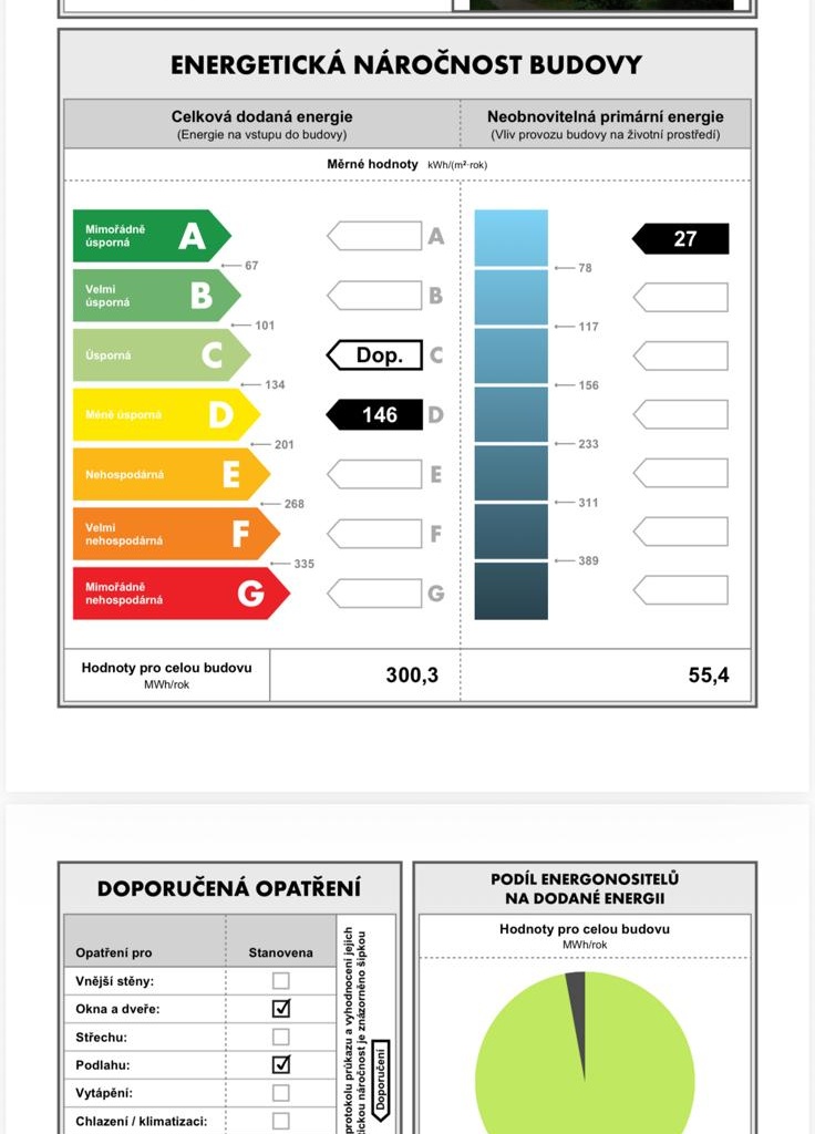 Ukazatel energetické náročnosti budovy:146 kWh/m²