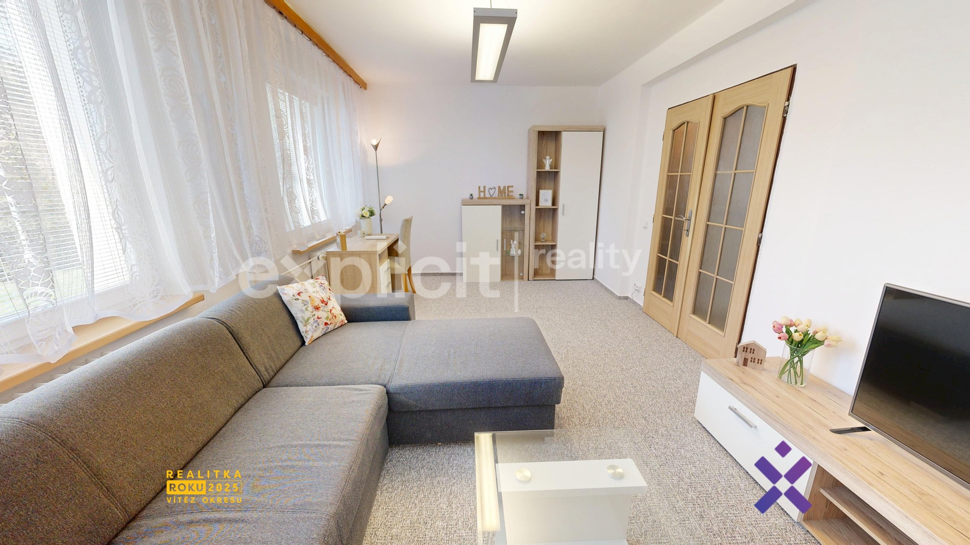 Obývací pokoj – rohová sedací souprava, skříňka pod televizi + TV a wi-fi router, konferenční stolek, psací stůl s židlí