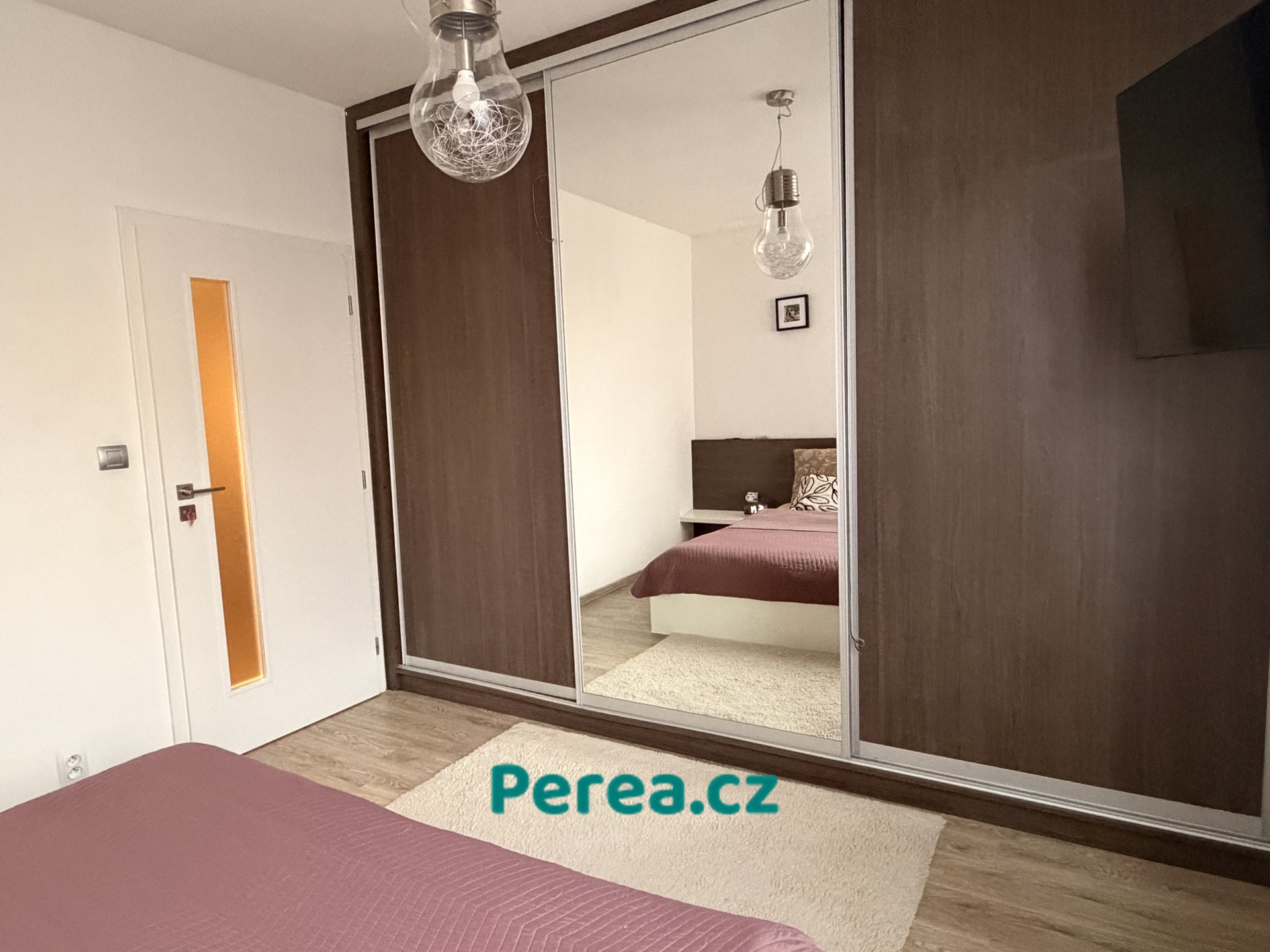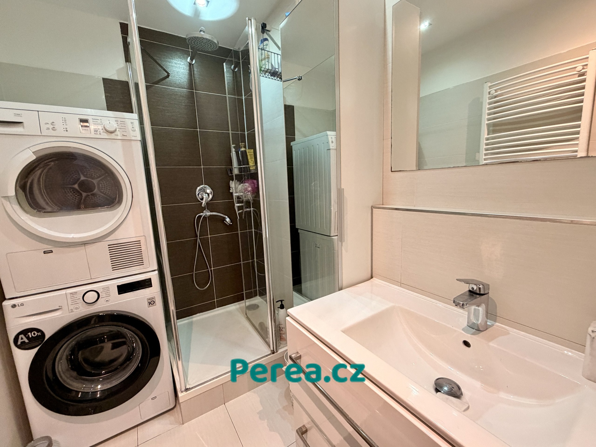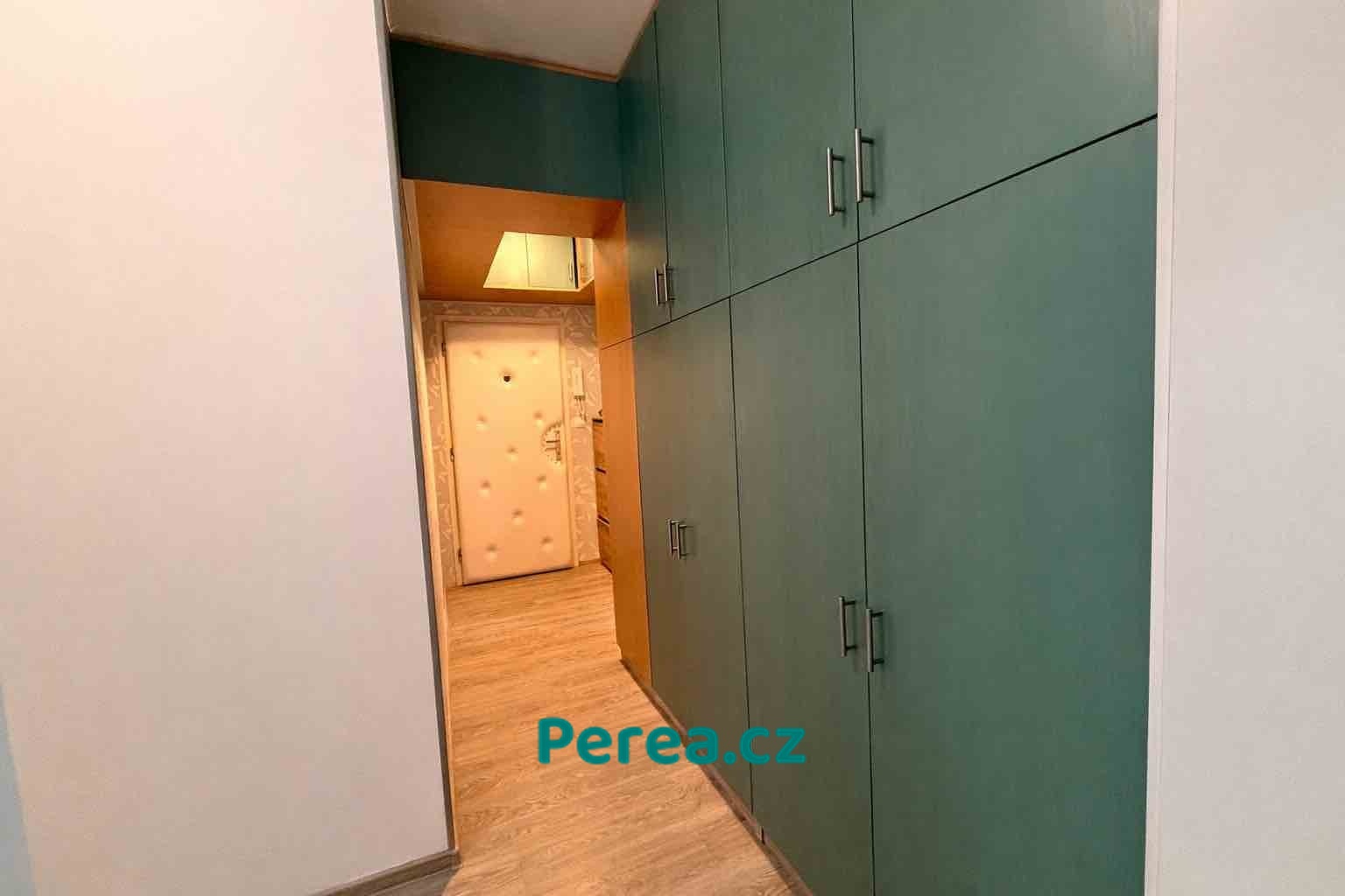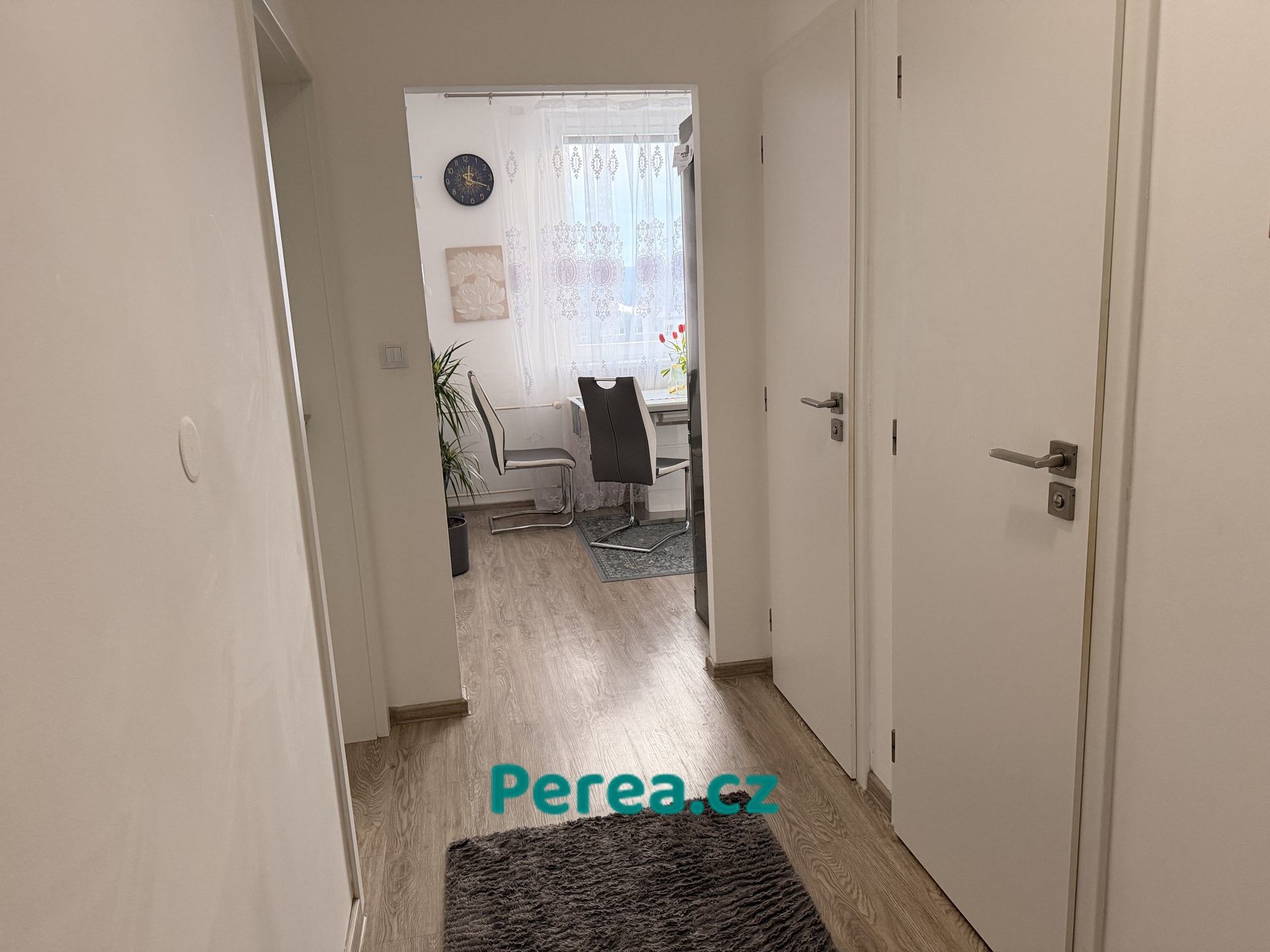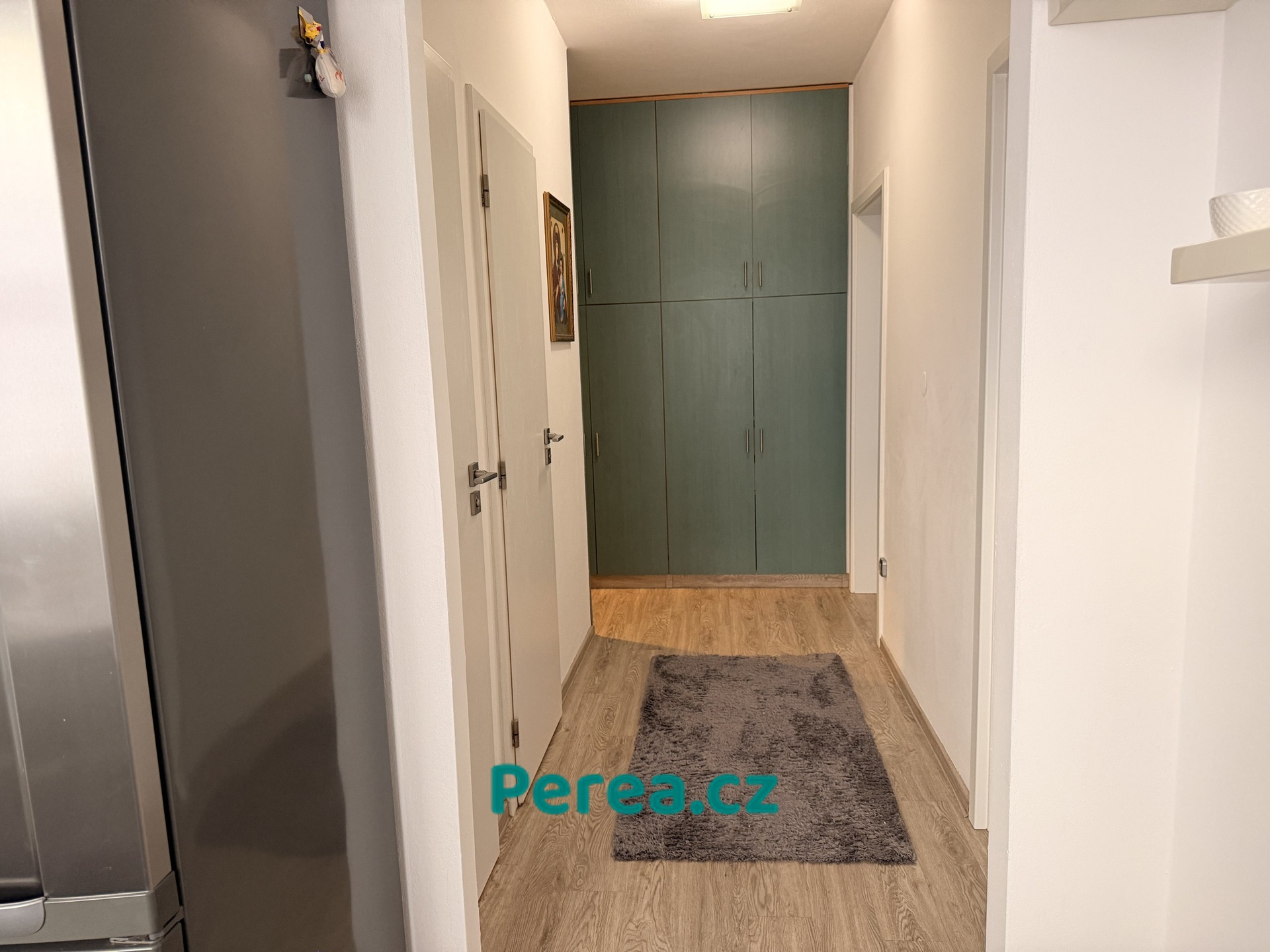 Dominantou bytu je moderní bílá kuchyň. Koupelna je vybavena sprchovým koutem, pračkou i sušičkou. V pokojích i na chodbě jsou praktické vestavné skříně, které nabízí dostatek úložného prostoru.