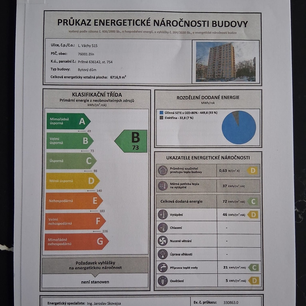 Ukazatel energetické náročnosti budovy:73 kWh/m²