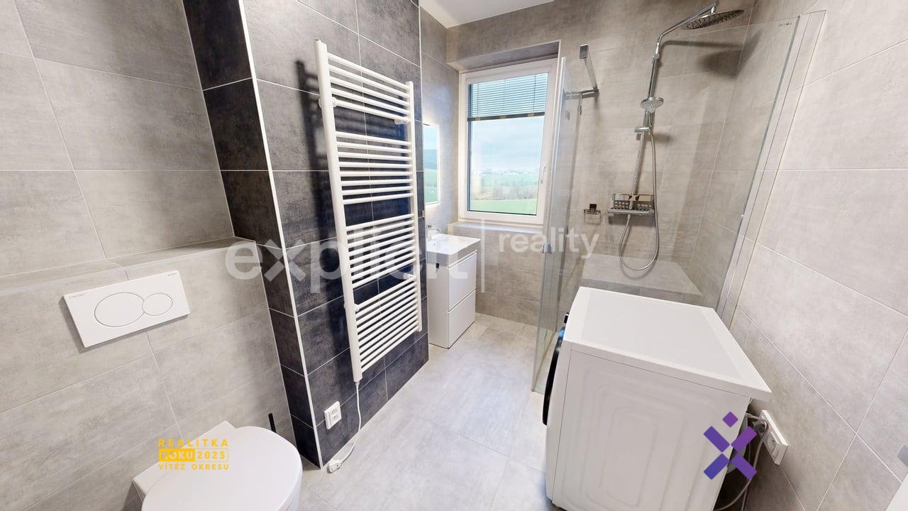 Koupelna je vybavena sprchovým koutem umyvadlem a skříňkou na osobní kosmetiku, topným tělesem a závěsným WC. Celý byt je vytápěn podlahovým vytápěním, které Vám zajistí velmi příjemný pobyt v každé místnosti. Okna jsou vybaveny žaluziemi i sítěmi proti hmyzu.