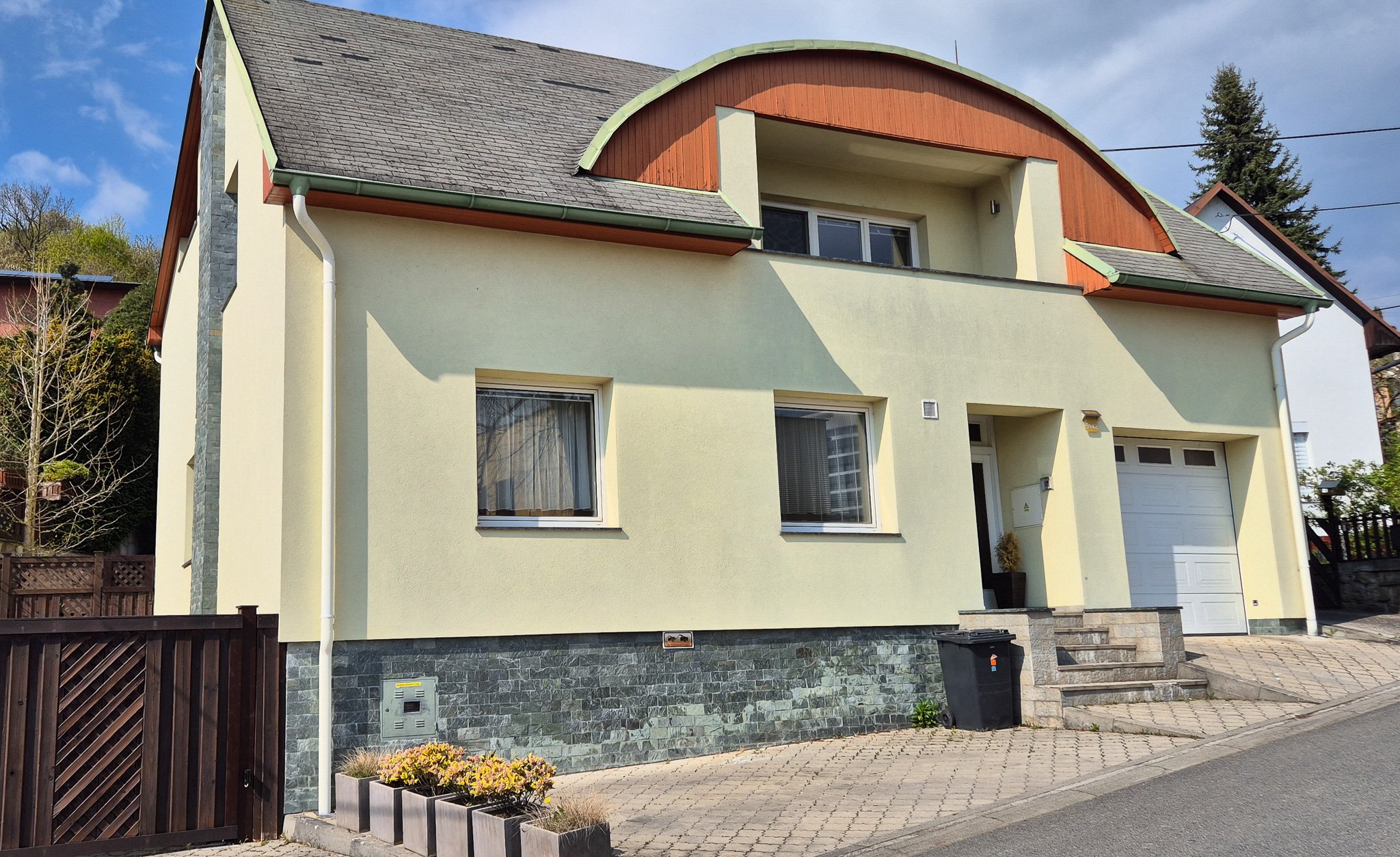 Dispozice: 1. patro: velká ložnice s balkonem s výhledem do zahrady, dětský pokoj, pracovna s balkonem a výhledem na centrum Zlína. Velká koupelna s masážní vanou a sprchovým koutem se sezením, samostatná toaleta, + bidet, + prostor s připojením pro pračku. Šatna. V patře se nachází také skrytý výstup na půdu která je obložená masivním dřevem. Celková plocha půdy je cca 70 m2.