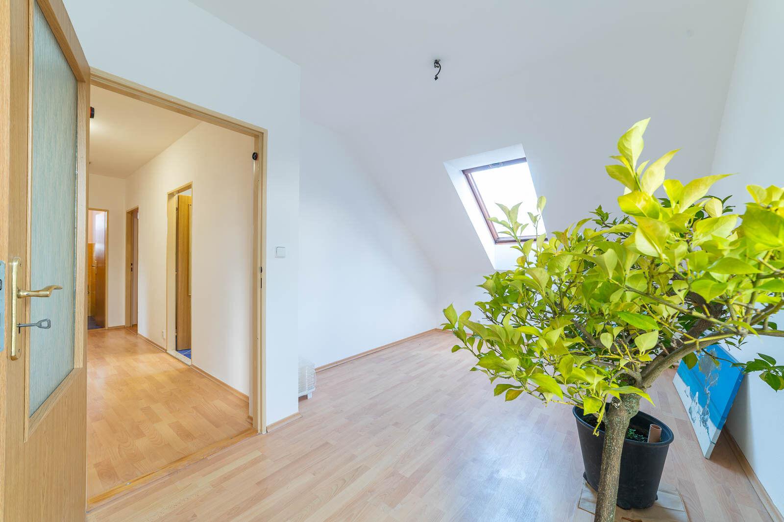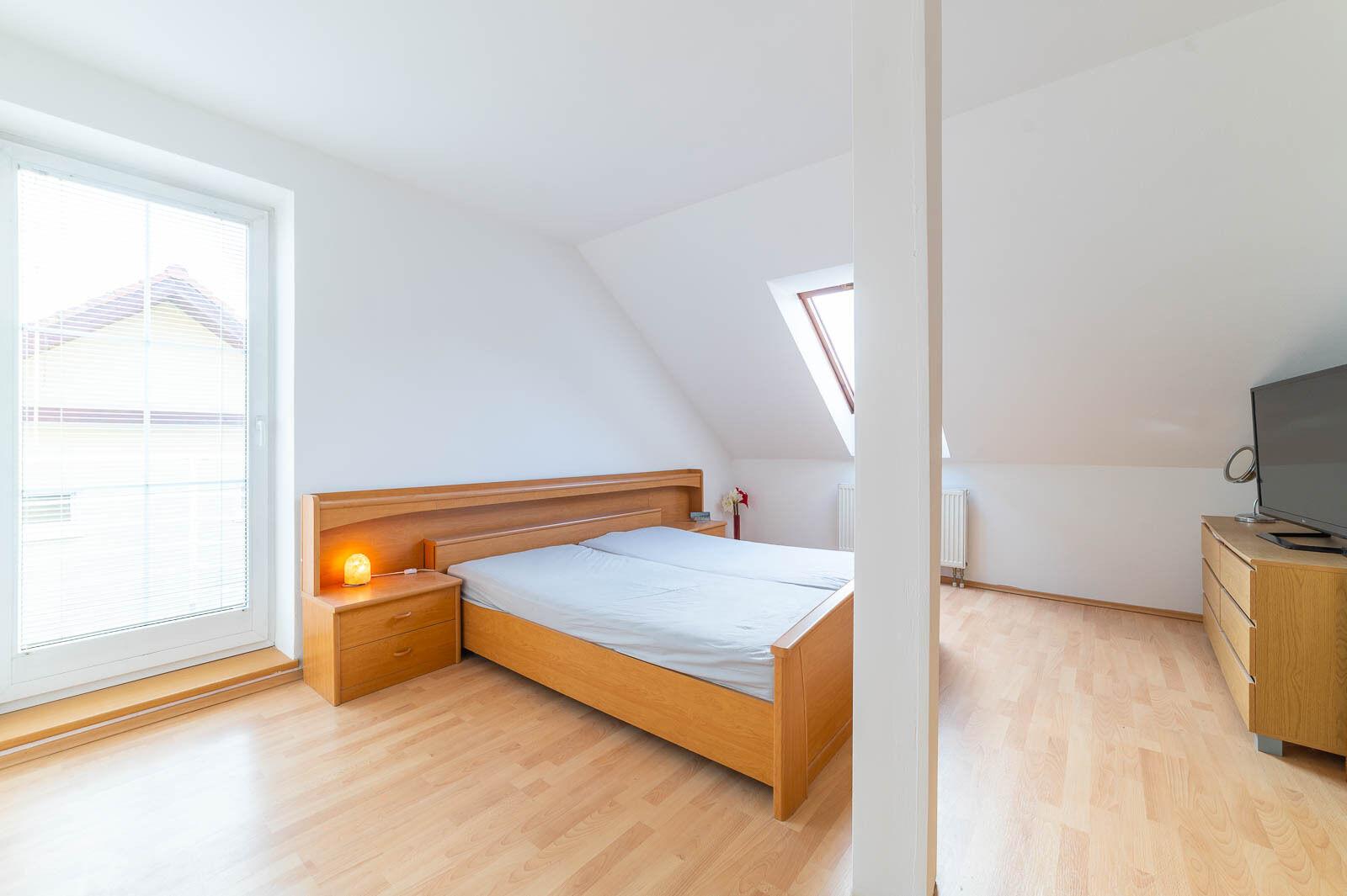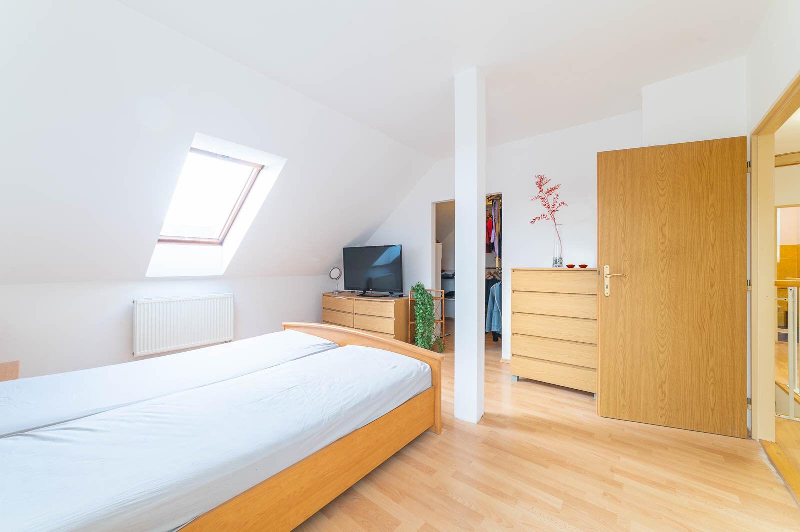 Hlavní ložnice navíc nabízí chytře řešenou samostatnou šatnu, prakticky skrytou v prostoru – detail, který ocení nejen dámy.