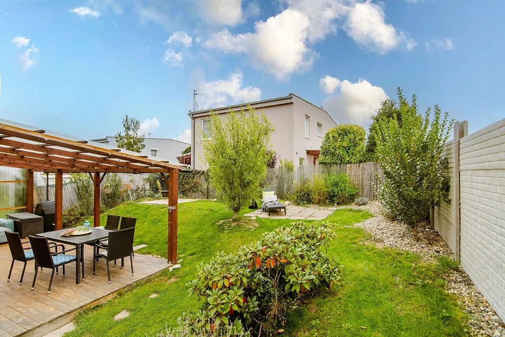 Dům bude možné mít částečně zařízený nábytkem. Zůstane kuchyňská linka s el. varnou deskou, el. trouba, digestoř a myčka, úložné prostory a 2 postele. Dále zastřešená pergola (cca 25 m2), která umožňuje příjemné posezení na terase a venkovní domek na nářadí. Součástí vybavení je i ostrovní fotovoltaická elektrárna na ohřev vířivky nebo vybudování menšího bazénu. Parkování je zajištěno pro 2 auta na vlastním pozemku přímo před domem. Vjezd a vstup k domu je ohraničen dálkově ovládanou posuvnou bránou a pozemek je vydlážděn zámkovou dlažbou. Zde je také nainstalovaný Wallbox na nabíjení elektromobilu, který je součástí vybavení domu.