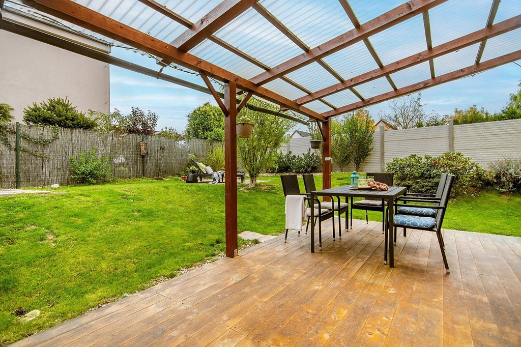 Dům bude možné mít částečně zařízený nábytkem. Zůstane kuchyňská linka s el. varnou deskou, el. trouba, digestoř a myčka, úložné prostory a 2 postele. Dále zastřešená pergola (cca 25 m2), která umožňuje příjemné posezení na terase a venkovní domek na nářadí. Součástí vybavení je i ostrovní fotovoltaická elektrárna na ohřev vířivky nebo vybudování menšího bazénu. Parkování je zajištěno pro 2 auta na vlastním pozemku přímo před domem. Vjezd a vstup k domu je ohraničen dálkově ovládanou posuvnou bránou a pozemek je vydlážděn zámkovou dlažbou. Zde je také nainstalovaný Wallbox na nabíjení elektromobilu, který je součástí vybavení domu.