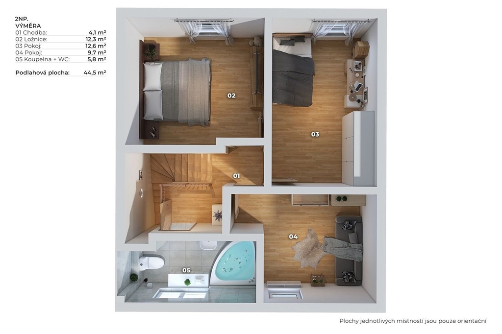 Orientace domu je na východ (pokoje a terasa) a na západ (kuchyňský kout, pokoj a koupelna). Dům sestává z přízemí, ve kterém se nachází vstupní chodba se zádveřím (12,4 m2), obývací pokoj (21 m2) se vstupem na prostornou terasu a přilehlou zahradu (167 m2), dále kuchyňský kout (6 m2), pracovna (5 m2), která je v současné době využívána jako posilovna, a koupelna se sprchovým koutem a s WC (4 m2). V horním patře se nachází ložnice (12,3 m2), 2 pokoje (12,6 m2 a 9,7 m2) a prostorná koupelna s oknem, s rohovou vanou a s WC (5,8 m2).