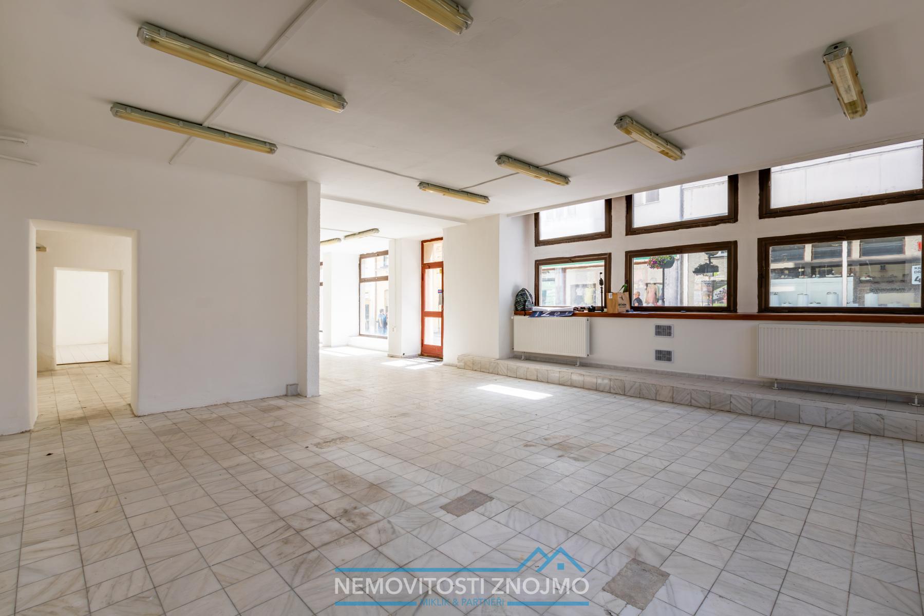 1.) komerční prostor (jedno z nejžádanějších míst pro umístění komerce ve Znojmě), 132m2, výlohy lemující opět obě ulice, jak Obrokovou, tak Horní náměstí