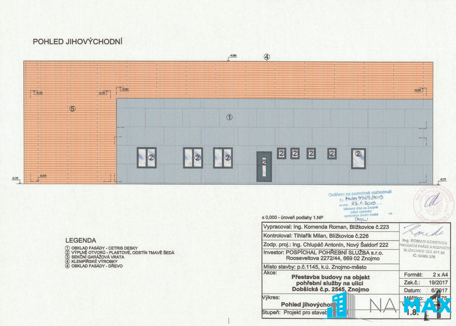 Na budovu bylo vydáno rozhodnutí a schválení stavebního záměru na stavbu : změna dokončené stavby - nástavba a stavební úpravy stávajícího objektu. Zastavěná plocha je schválena stávající, tzn. 294 m2 a výška stavby 8,09 m.