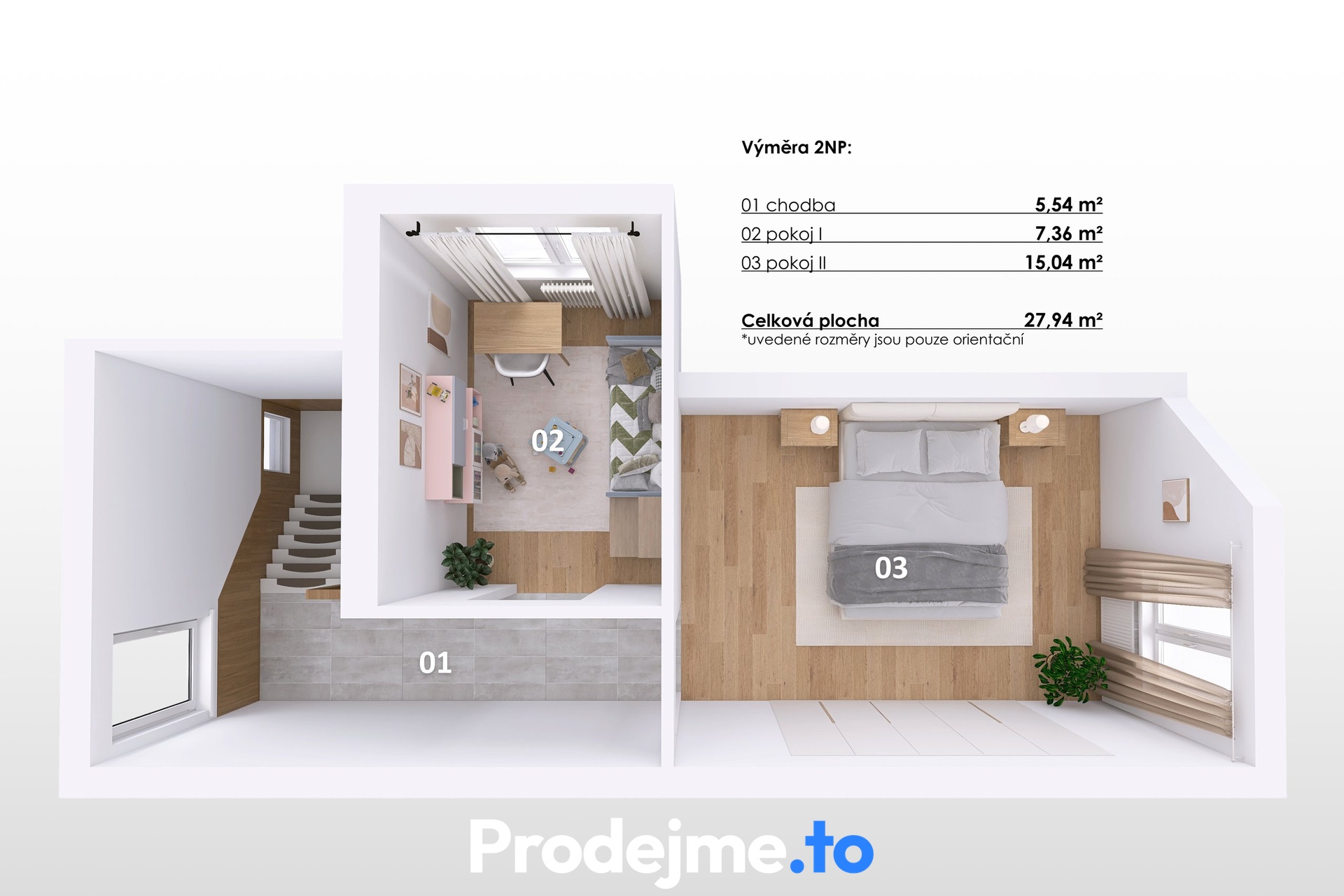 Patro naopak patří klidu a odpočinku. Dva pokoje o velikostech 15 m² a 7 m² jsou ideální jako hlavní ložnice a útulný dětský pokoj.