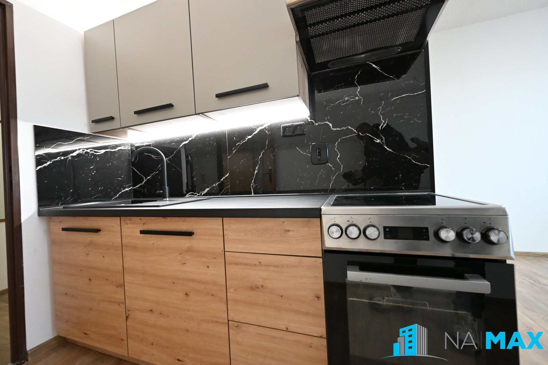 V kuchyni je běžná kuchyňská linka s granitovým dřezem, samostatně stojící sporák s elektrickou troubou a sklokeramickou varnou deskou, odsavač par.