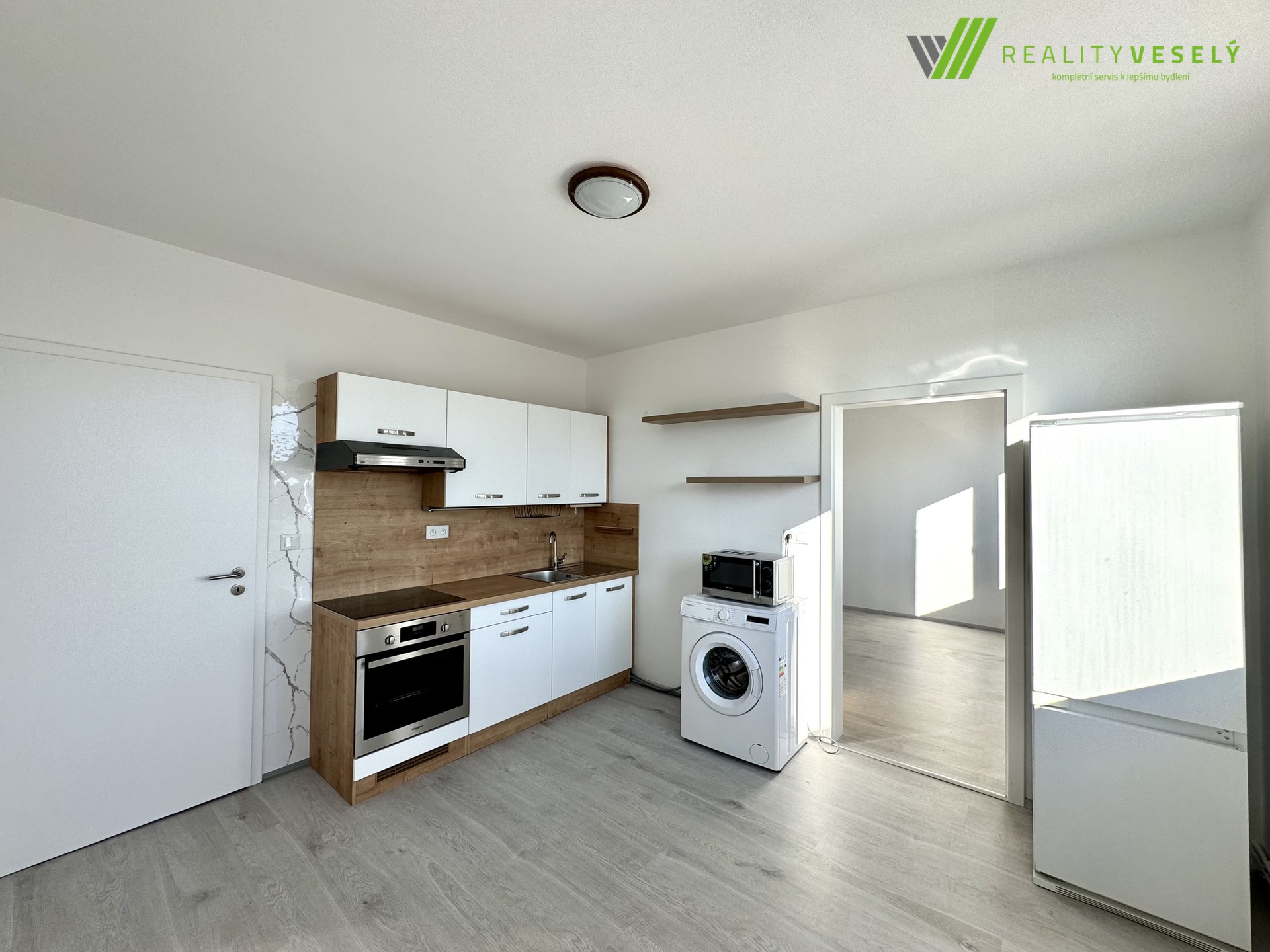 Byt se skládá ze vstupní chodby, z níž je vstup do koupelny se sprchovým koutem, umyvadlem a toaletou. Z chodby dále vcházíme do pokoje s plně vybaveným kuchyňským koutem, jehož součástí je indukční varná deska, pečicí trouba, odsavač par, mikrovlnná trouba, lednice a také pračka. Na pokoj s kuchyňskou linkou navazuje další prostorný pokoj. Oba pokoje disponují vnitřními zatemňujícími roletami.