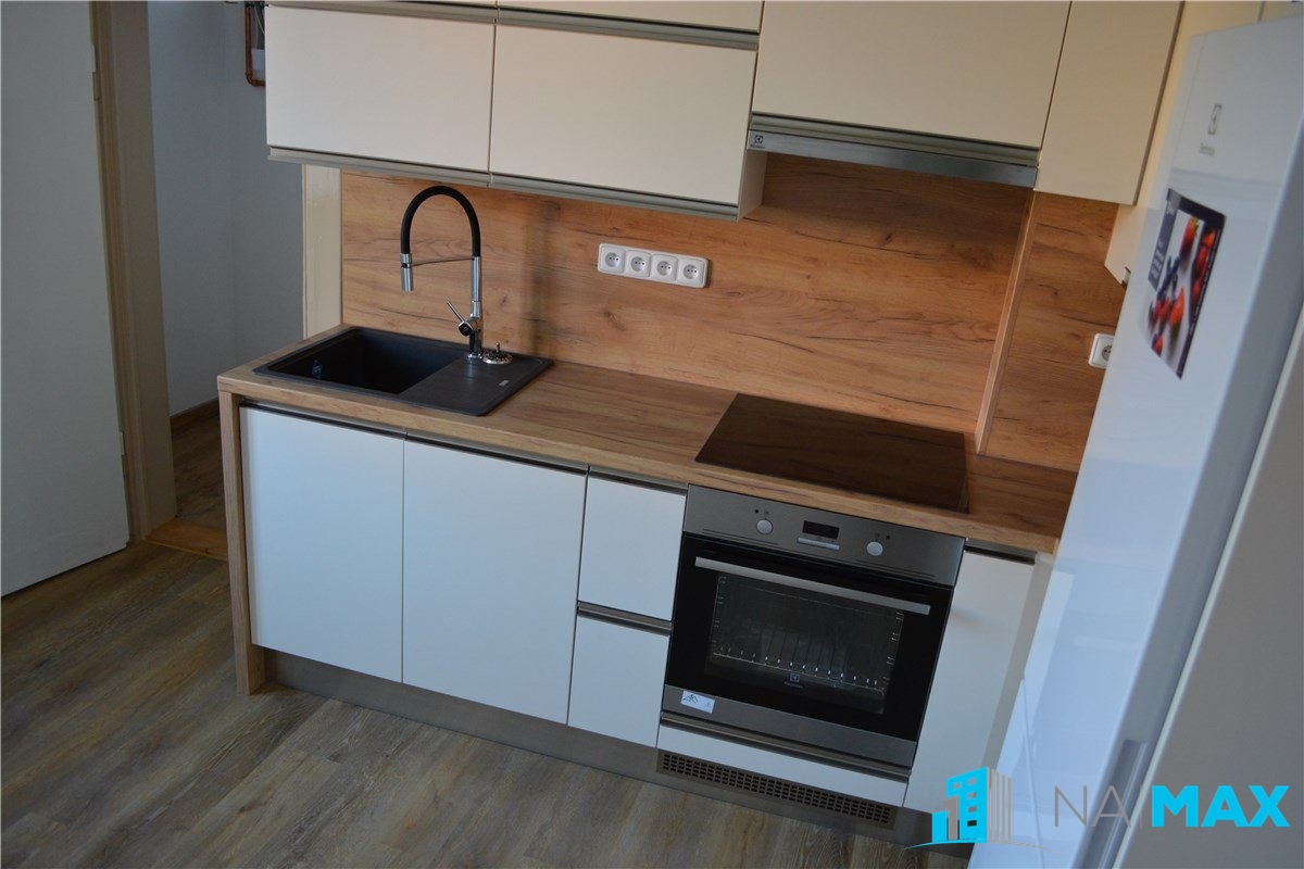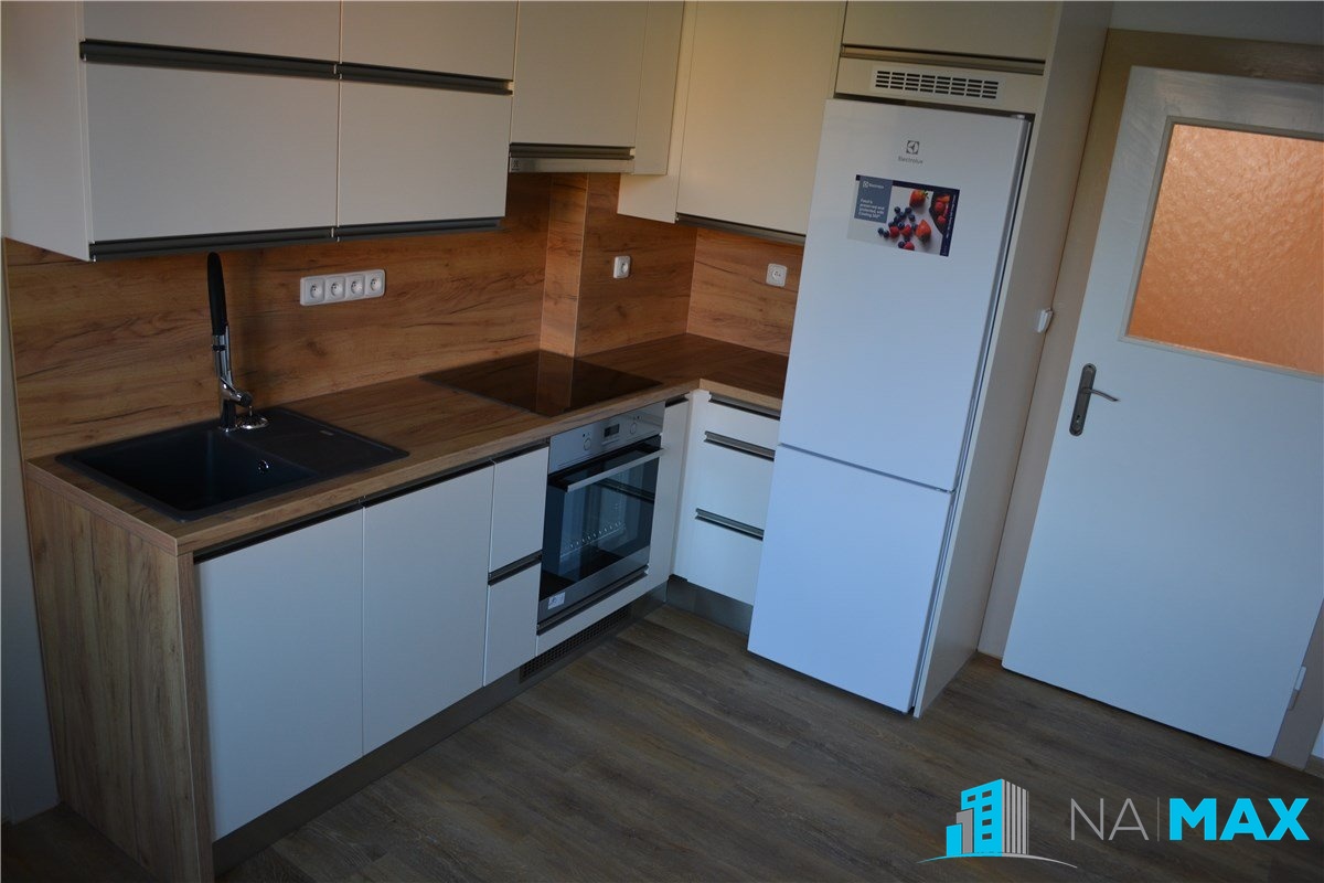 V kuchyni je nová kuchyňská linka s granitovým dřezem, vestavěná elektrická trouba, indukční varná deska, myčka, lednice.