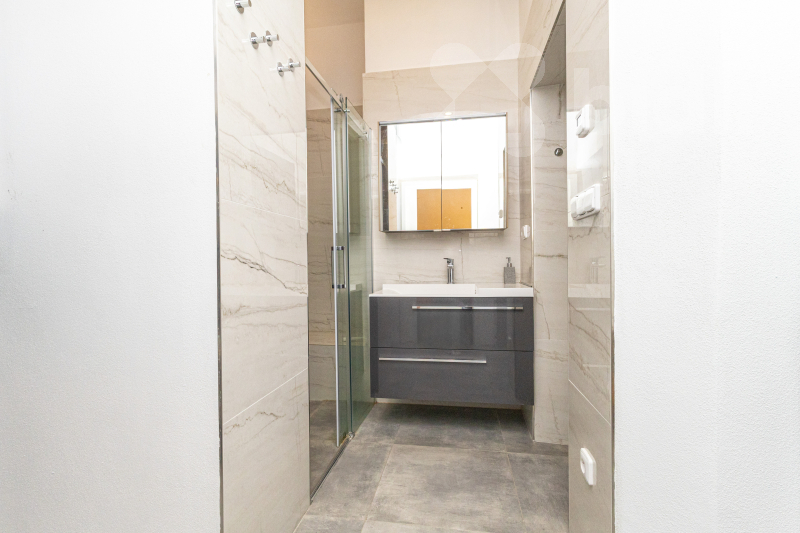 Dvě prostorné ložnice poskytují soukromí i klid a díky vysokým stropům i velkým oknům působí vzdušně a elegantně. Komfort bydlení podtrhuje praktická koupelna.